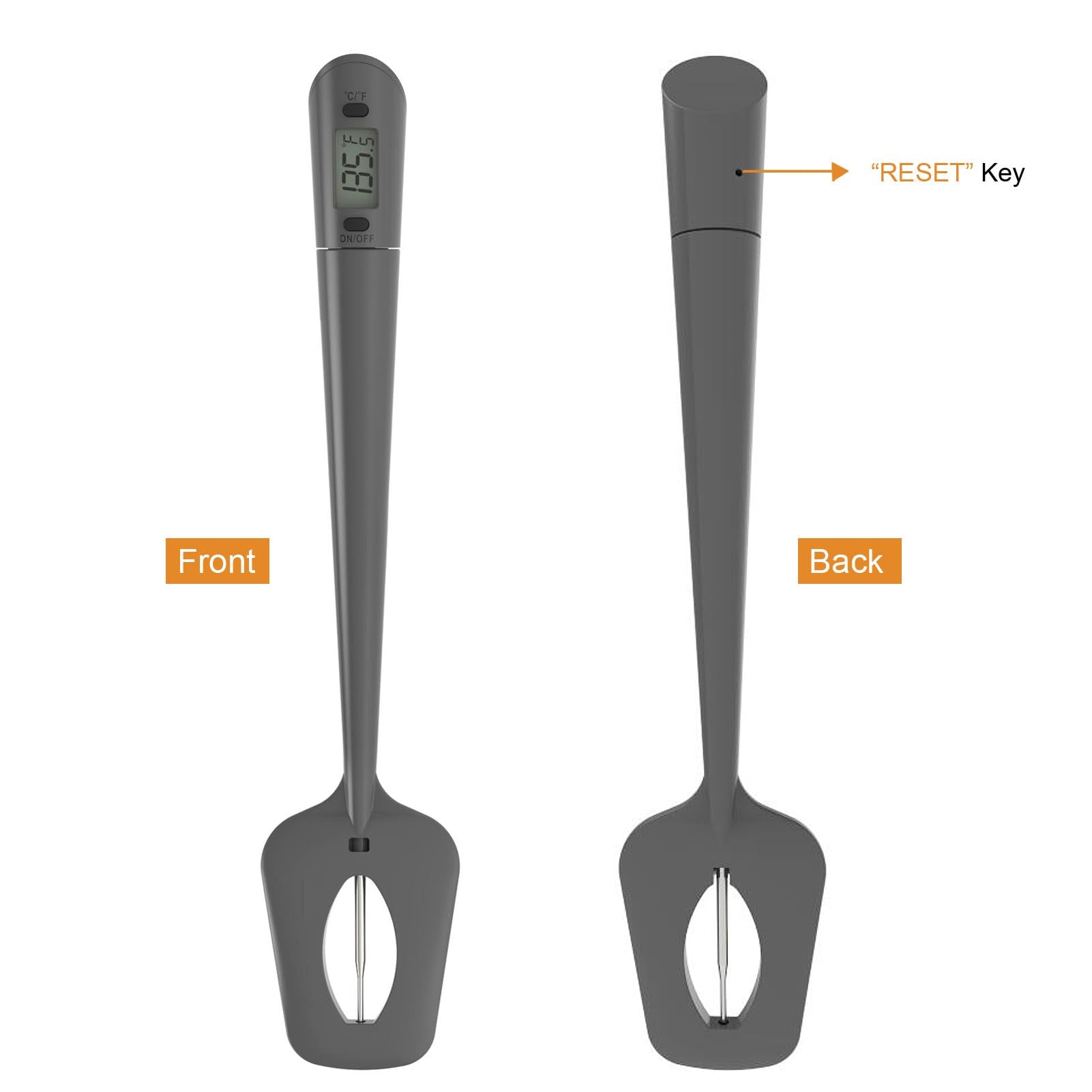 - MULTIPURPOSE DIGITAL COOKING THERMOMETER SPATUAL WITH CLIP – 12-Inch Probe Built in Thermometer Spatula Kitchen & BBQ Grill Tool Reads Internal Temperature of Chocolate, Liquid Candy, Deep-fry, Sauce, Syrup, Meat & More