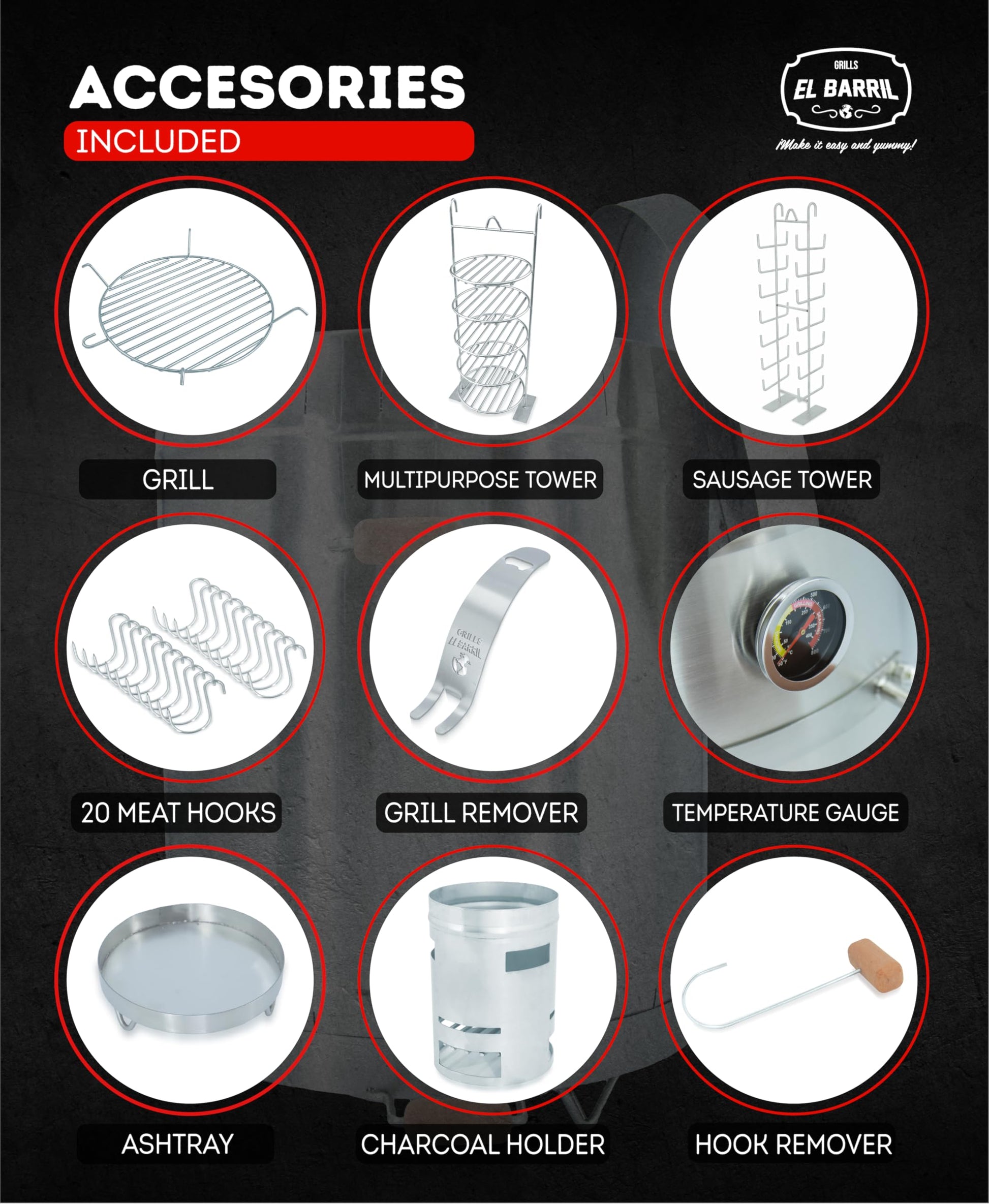 - Full Combo: Our 60lbs portable Smoker & Grill Barrel with heat-resistant handles at the sides & on the cover top, comes with 20 Stainless Steel Hooks, 1 Hook Remover, 1 Large Sausage Cooking Tower, 5-tier Multipurpose Cooking Tower, 1 Grill & its remover, 1 Charcoal Holder & ashtray, and a temperature gauge