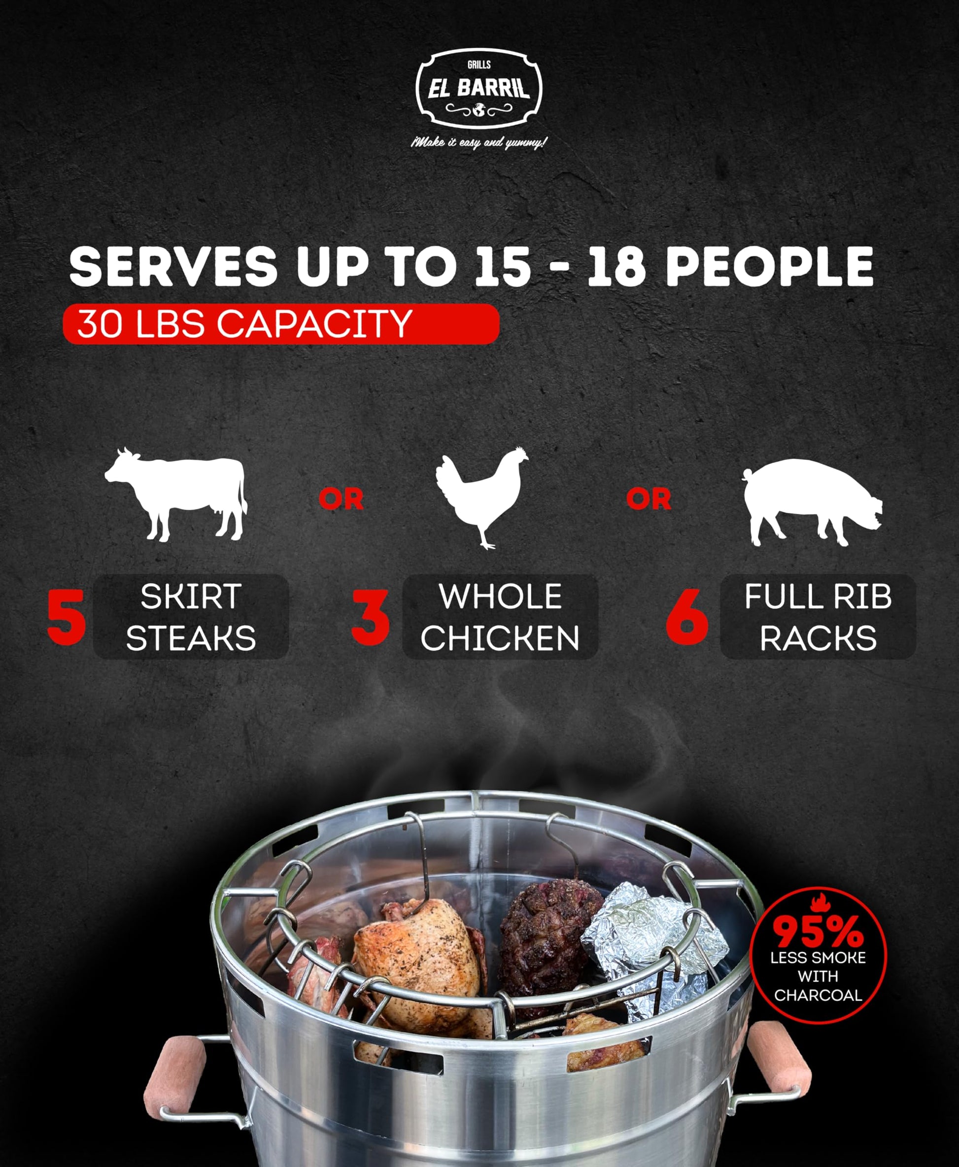 - 30 lbs Meat Capacity: Cook for the Whole Family or a Crowd: With an impressive 30 lbs of cooking capacity, the medium barrel lets you smoke, roast, or grill multiple cuts of meat at once. Perfect for weekend cookouts, tailgating, camping trips, and family feasts.