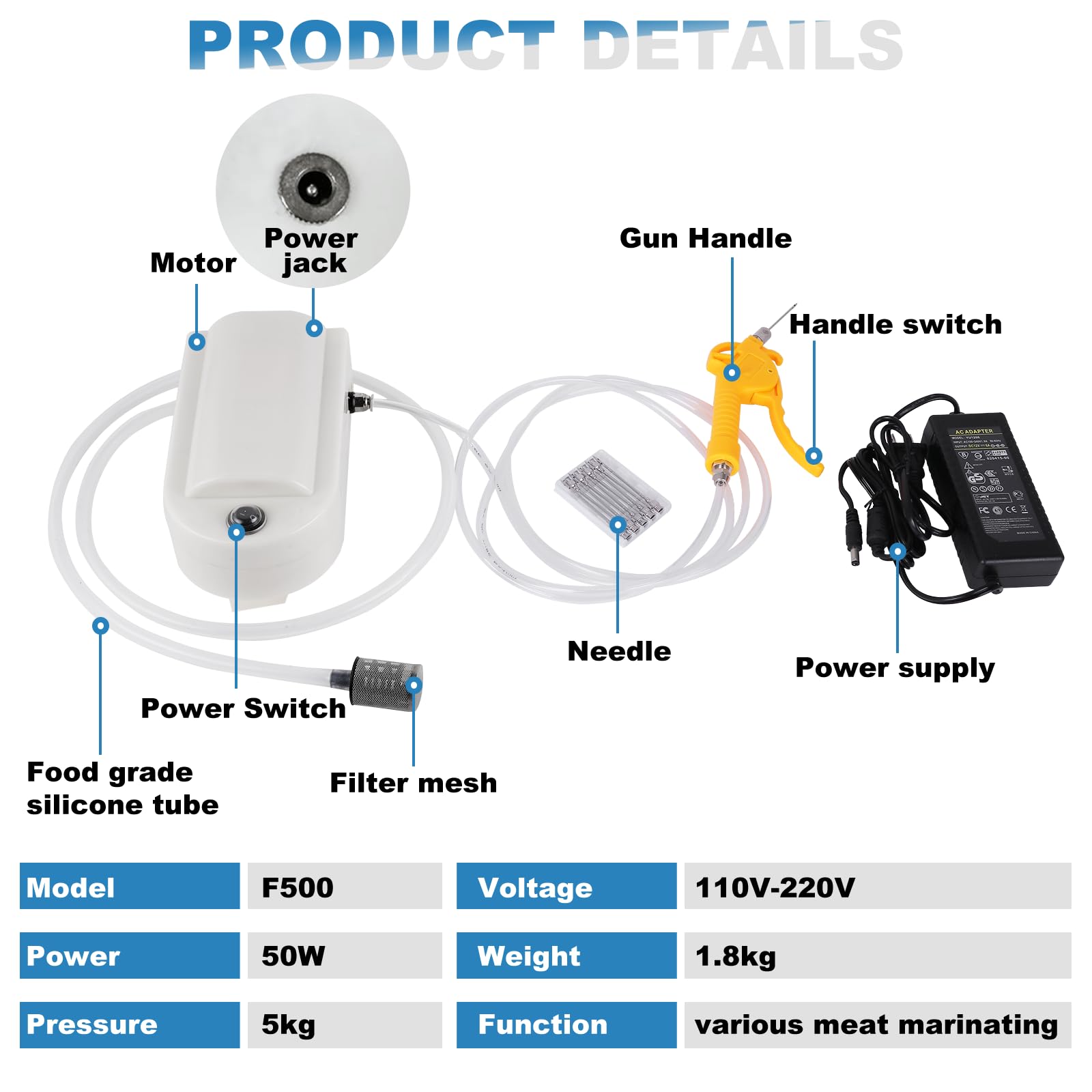 - [Package includes]: 1x Meat injector gun, 1x Food grade silicone tube, 1x host, 1x Filter screen, 10x Needle, 1x Power supply, 1x User manual