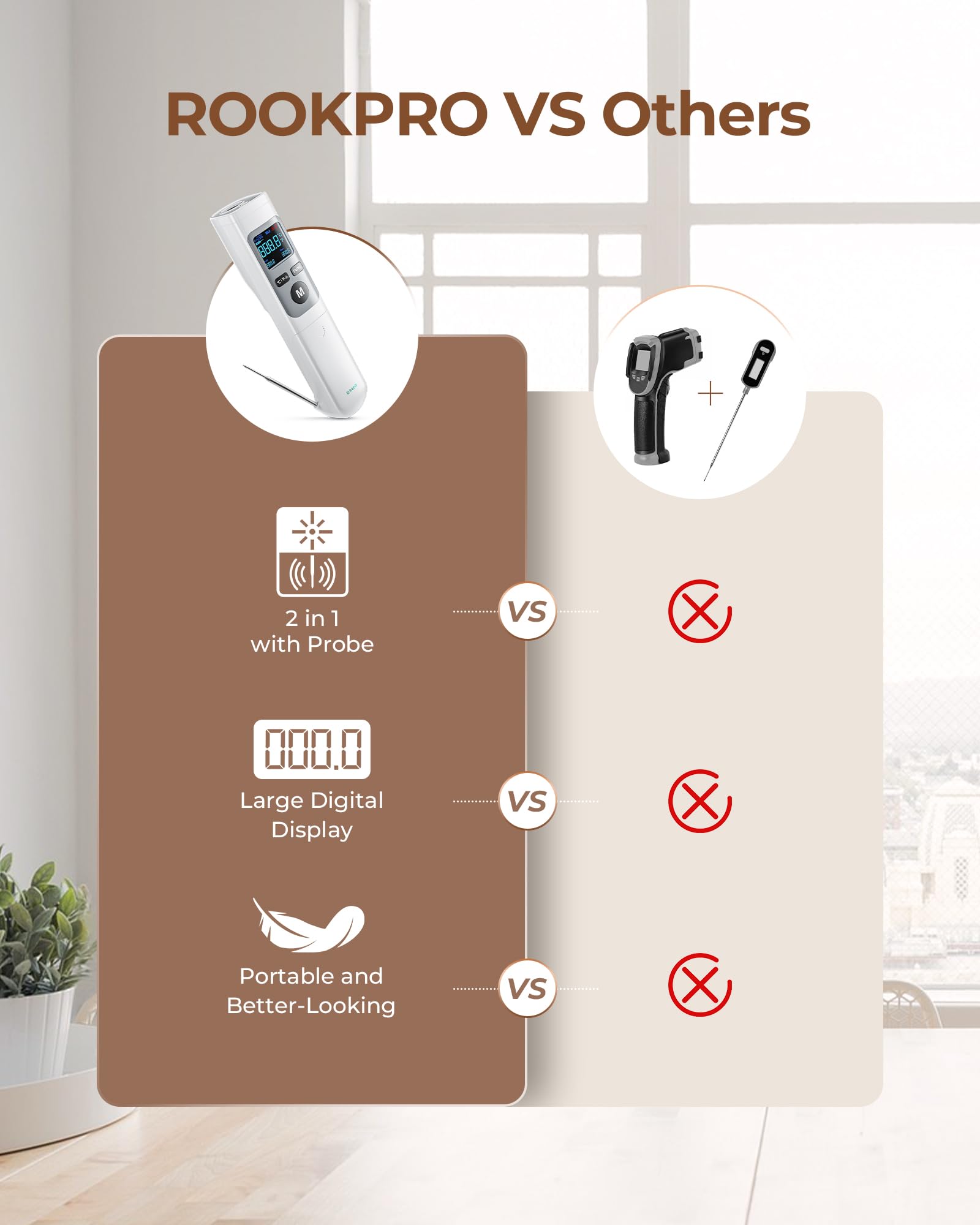 - 2-in-1 IR Thermometer Gun: Unrivaled and innovative design as an upgrade to digital meat thermometers and temperature guns, The ROOKPRO can measure both internal and surface temperatures, Use as a surface thermometer for a griddle with the IR sensor, and a BBQ thermometer for food with the meat thermometer probe