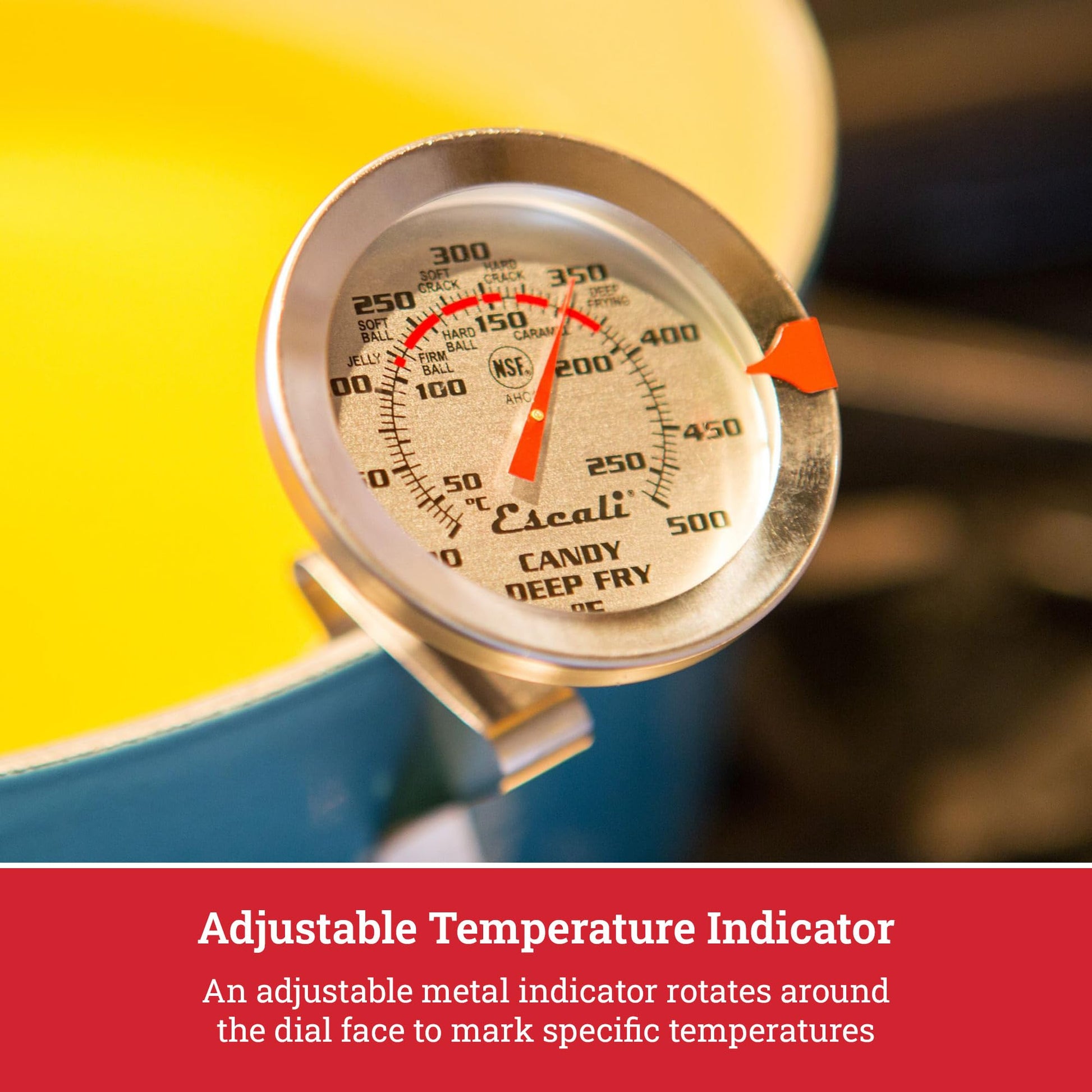 Details: Long Stem Probe: The Escali Candy / Deep Fry Thermometer will help you cook candy or deep fried foods to the perfect consistency. The easy-to-read dial display features various confectionary cooking temperatures and an adjustable temperature indicator for quick reference. Its durable stainless steel design is NSF certified, oven safe, and dishwasher safe. Confectionary Temperature Zones: The dial face includes temperature zones indicating jelly, soft ball candy, firm ball candy, hard ball candy, hard crack candy, caramel and deep frying temperatures. Adjustable Temperature Indicator:: An adjustable metal indicator rotates around the dial face to mark specific temperatures. NSF Certified: The manufacturing process of this product is regularly checked and certified by the National Sanitation Foundation and meets the highest standards for public health protection. Hands-free Vessel Clip: A stainless steel clip holds the kitchen thermometer in a pot, or any vessel, for continuous hands-free measurements. Large Easy to Read Dial: The large dial is easy to read, shatterproof and features both Fahrenheit and Celsius measurements. Oven Safe: The durable stainless steel construction allows the thermometer to be used in an oven or grill. Dishwasher Safe: The premium stainless steel construction is durable and dishwasher safe. Additional search terms: candy thermometer for candy making, frying thermometer with clip, sugar thermometer
