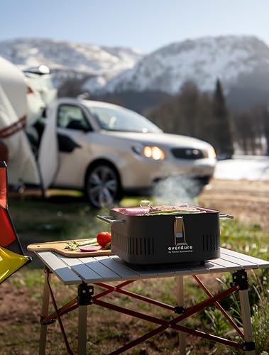 Everdure CUBE Portable Charcoal Grill, Tabletop BBQ, Perfect Tailgate, Beach, Patio, or Camping Grill, Lightweight & Compact Small Grill with Preparation Board & Food Storage Tray, Matte Black