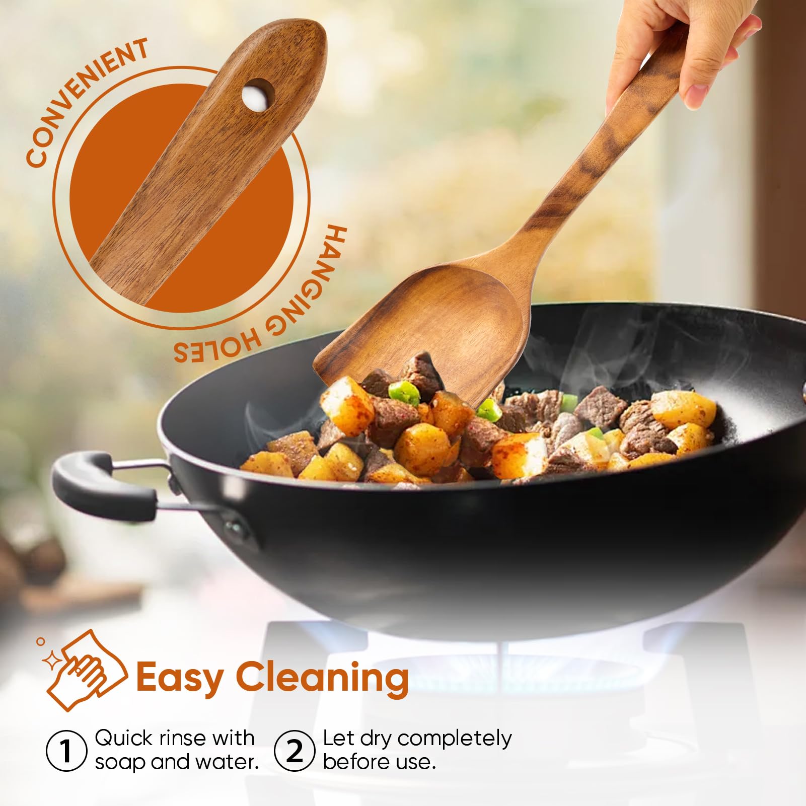 - NATURAL TEAK: Our wooden cooking utensils set is made of natural solid teak wood, which is healthy and safe. Teak has a dense grain and a hard texture that won't crack, making it one of the most durable woods, stronger than silicone or bamboo. The wooden cooking utensils have been hand sanded many times for a smooth surface that won't harm any cooking tools.