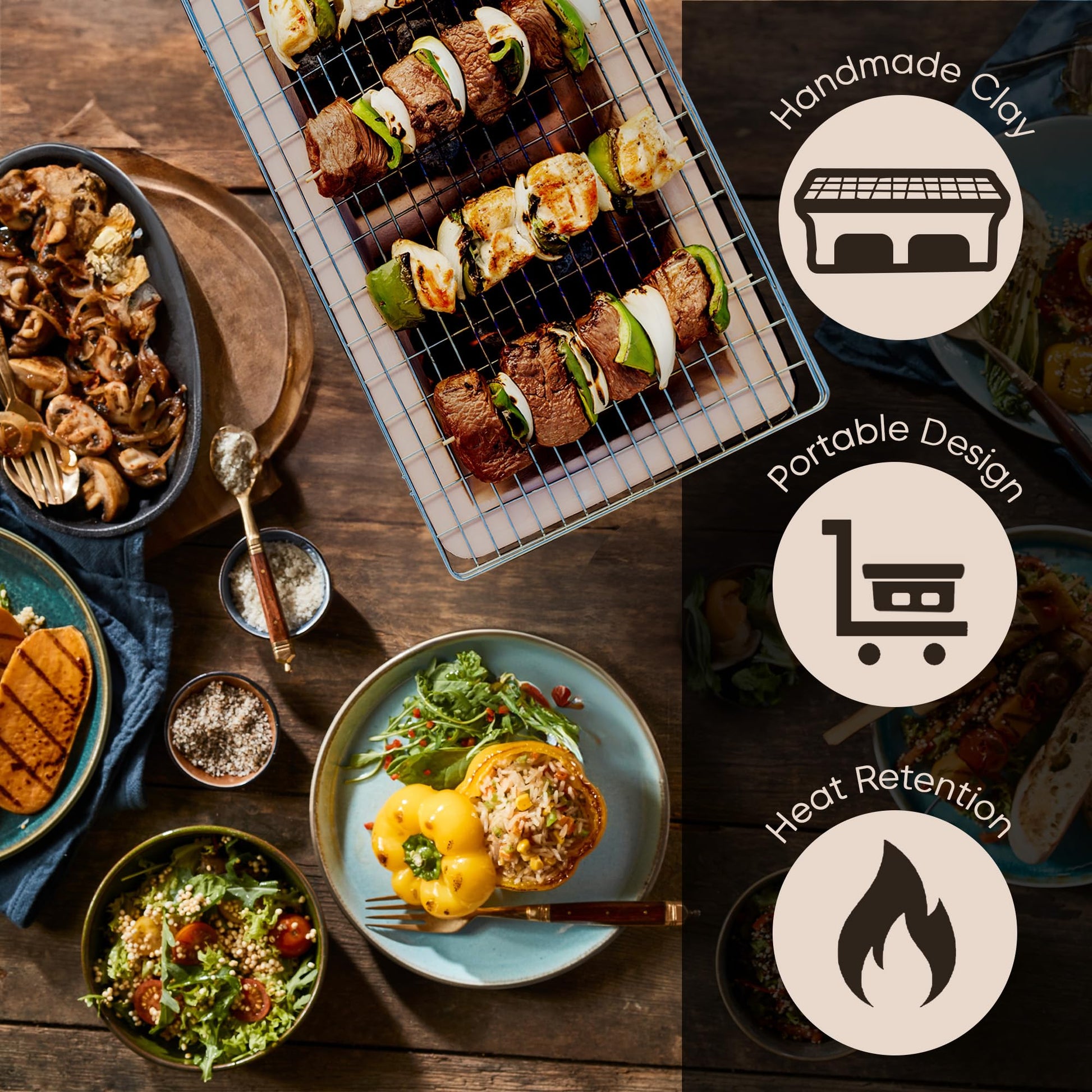 - 17“ x 10" cooking surface area | Stand with handles included | This outdoor grill features a handmade clay construction.
