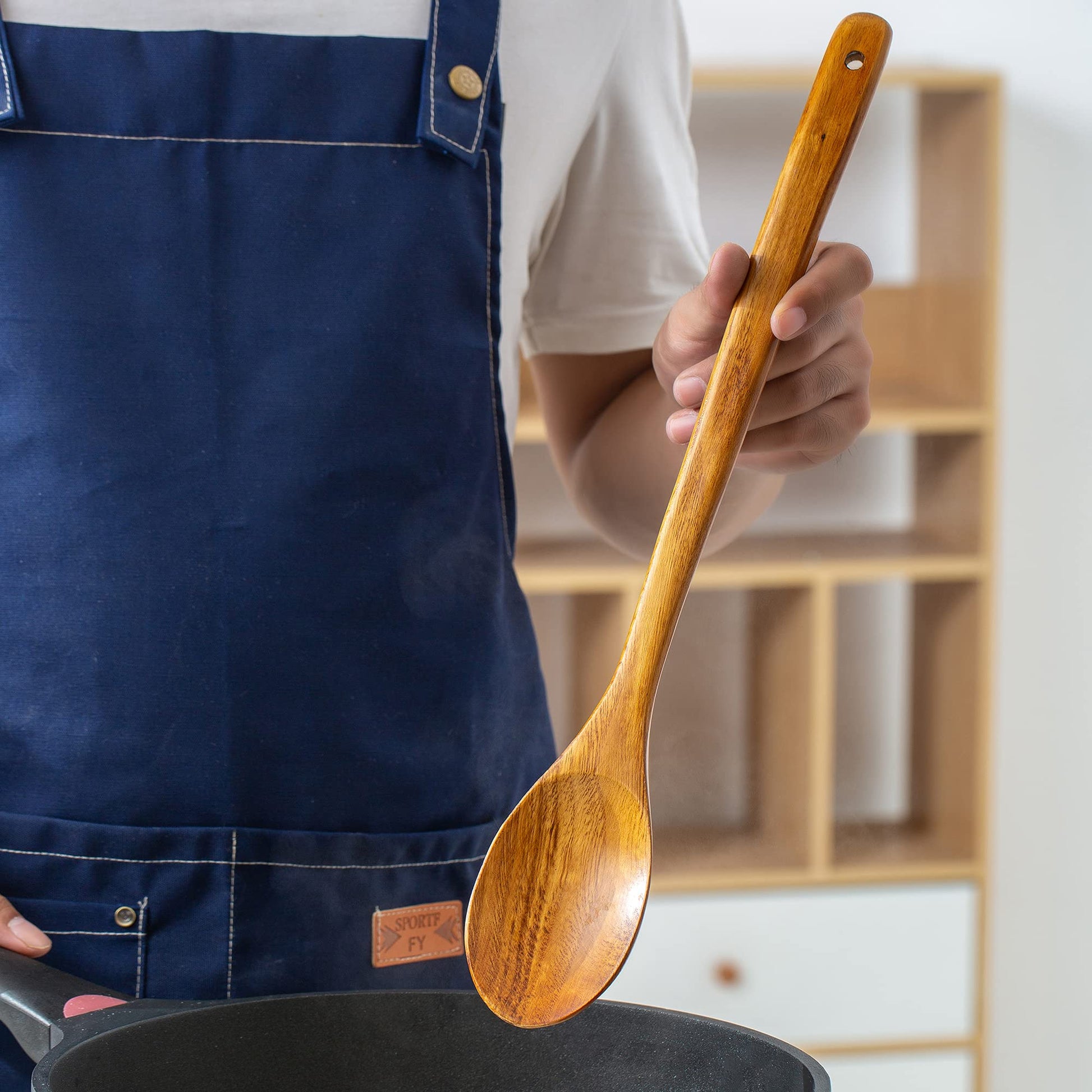 - Convenient Storage: Say goodbye to cluttered countertops with our wooden cooking spoon.Featuring a hollow hanging buckle at the tail, it offers convenient storage while saving precious space, ensuring your kitchen remains organized and tidy at all times