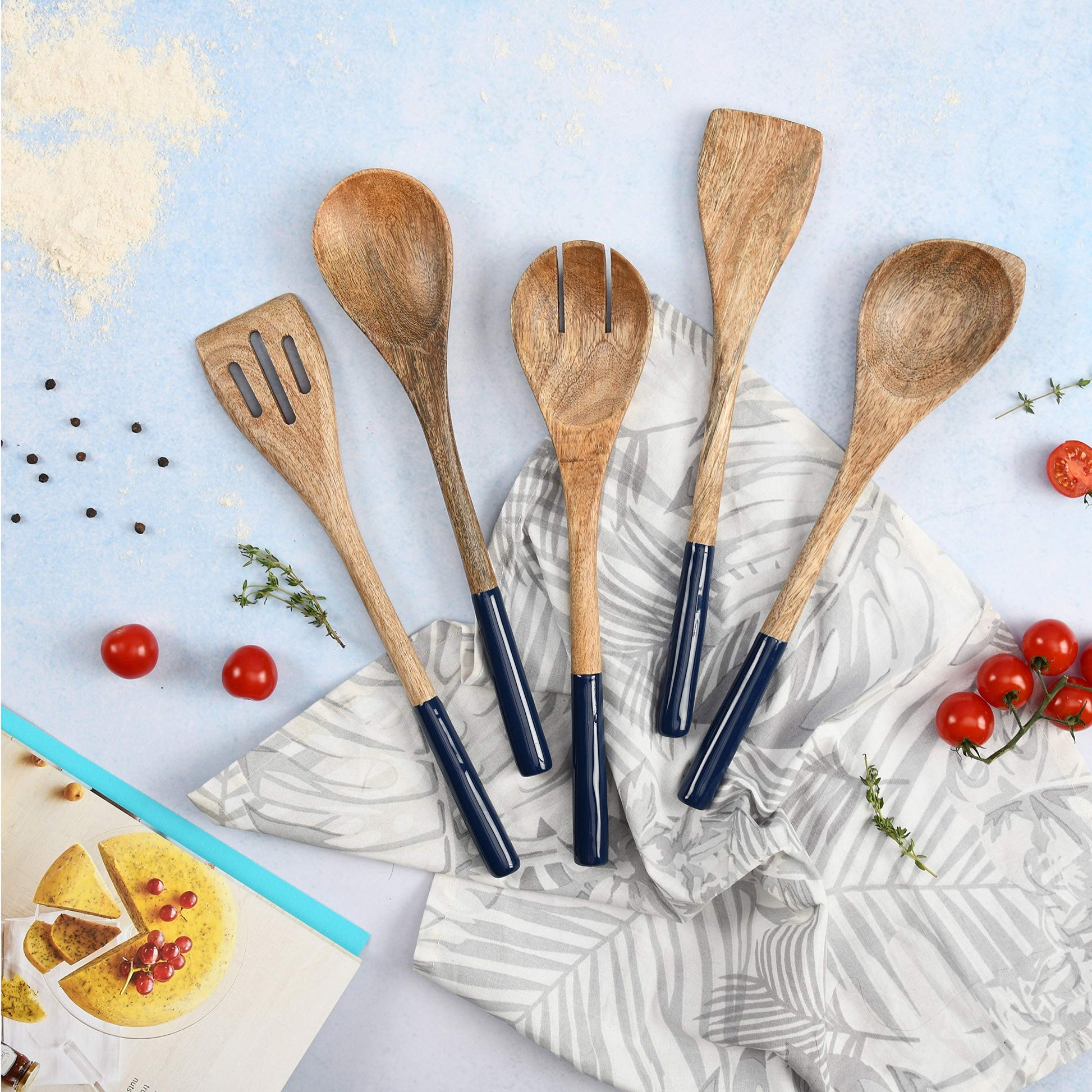 - COMPLEMENTING YOUR KITCHENWARE- The wooden cooking utensils set or wooden spoons for cooking for kitchen essentials are an exquisite collection handicrafted by natural mango wood available in a unique set of 5 including a cooking spoon, wooden spatula or turner, slotted spatula or turner, fork and corner spoon.