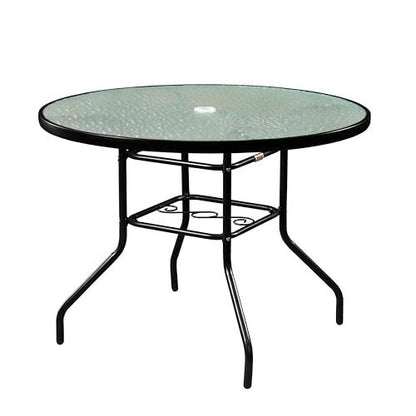 Details: Many outdoor meals are to be had on this furniture piece! This product is durably crafted from tempered glass and a captured rim, to protect the safety of all who use it. In the center of the table there is a place to put an umbrella through the center, being supported on all sides so that the it does not tip over. Glass top has a wavy texture that will hide smudges and stains better than a flat glass top. Simple instructions are included to offer a quick assembly process.