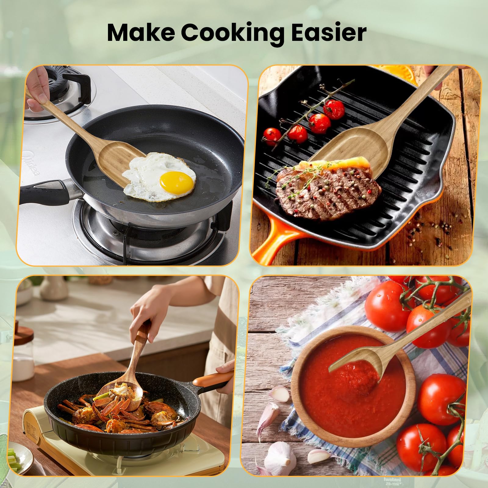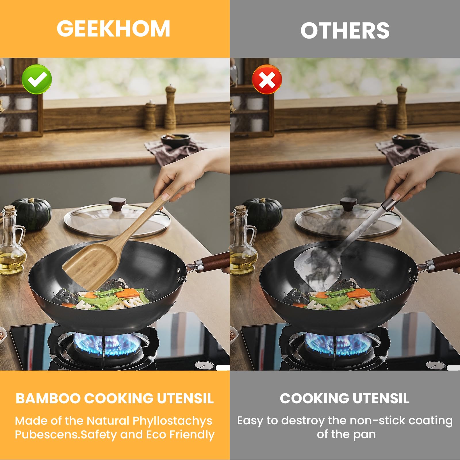 - Safe and Natural Bamboo Kitchen Utensil: These cooking utensils are made of the 100% bamboo, eco-friendly, oderless, healthy for your family; The low carbon manufacturing bamboo spatula contribute to green living that help conserve resources, also thery can fit various wok and pan