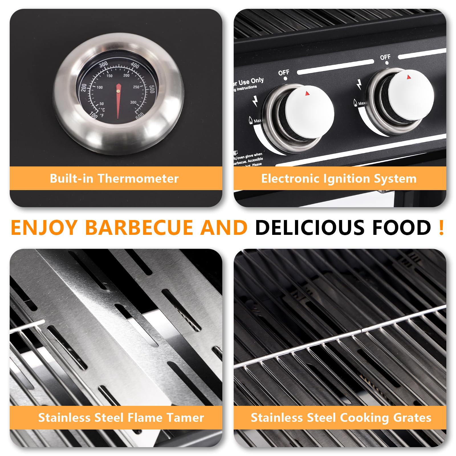 - High-Quality Material: The propane gas grill frame is made of selected cast iron with excellent heat and rust resistance for safe long-term use.The cooking grate and warming rack area use durable and easy-to-clean stainless steel, it effectively prevents warping and cracking during high-temperature cooking.