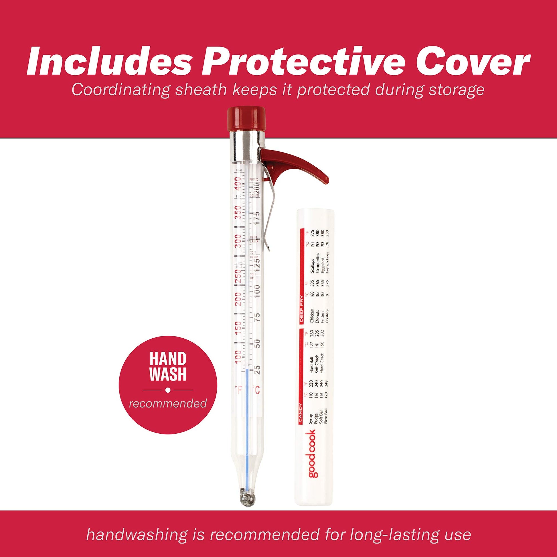 - Protective storage sleeve includes a temperature guide for candy making and deep frying.
