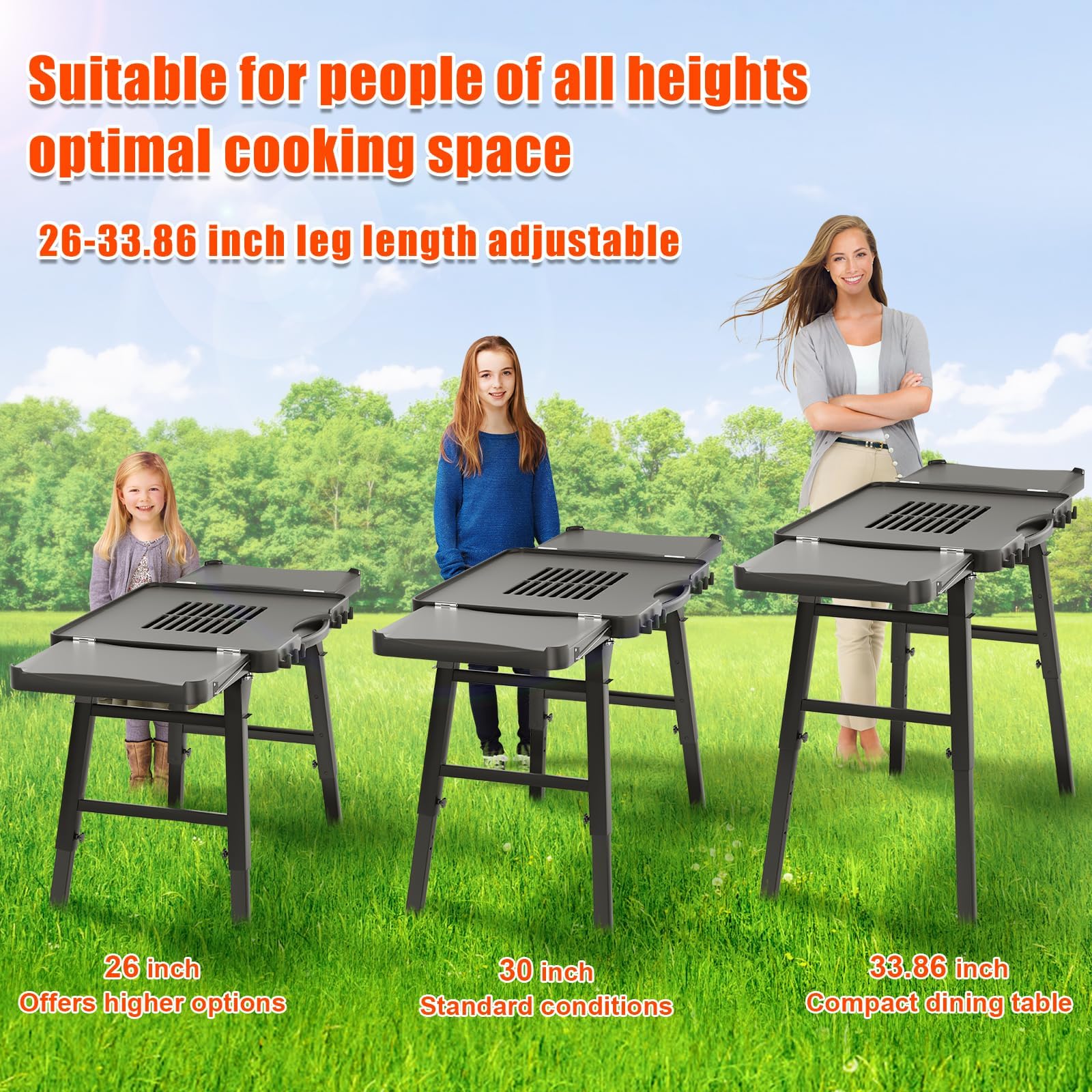 - 【Adjustable Feet】- This portable grill table features four-foot knobs for easy adjustment, offering three height options: 26 inches, 30 inches, and 33.86 inches. Suitable for people of different heights, ensuring comfort and accessibility for all family members.