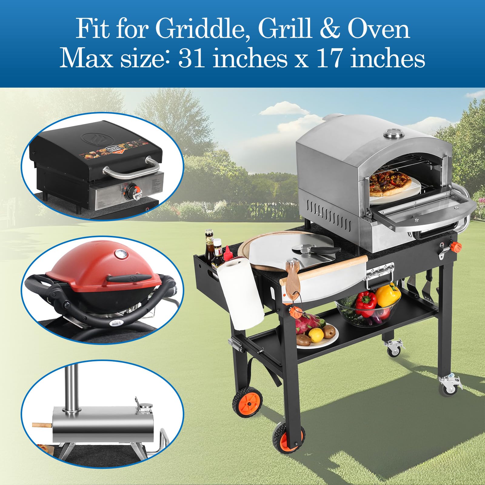 - Universal Folding Grill Cart:Designed for Blackstone 17-22“ grills, Ooni 12” pizza ovens, Ninja grills, and more Spacious double shelves provide extra space for tools, ingredients and utensils.