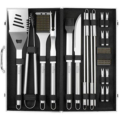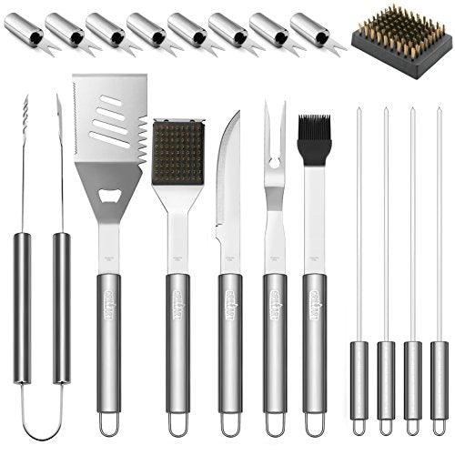 Details: Look Like a Pro by Use Grillart 19 Stainless Steel BBQ UtensilsIf you’re a Grill master who is searching for a lifetime purchase of high quality BBQ, tools, the products is the answer you’ve been looking for. We offer a full range of BBQ accessories meet all your needs, the high quality stainless steel grill tools set is not easy to bend, break, or rust quickly,And pliers made of thickened stainless steel, easier to clip food. Food-grade stainless steel that can be used with ALL foods and on any grill, whether you are using a gas, propane, charcoal, or electric barbecue.Ergonomic handles, in an innovative elliptic cylinder shape, designed to feel comfortable in the palm of the hand for long periods, insulate heat, AND provide a strong, non-slip grip for complete control.Great BBQ Grill GiftThis’s a great BBQ grill gift set for father’s day, friends, or anyone you like. They also can be great outdoor BBQ, cooking and grilling accessories and tools for picnic, for party……Fine BBQ Tools, Efficient Grilling :1 x Tongs1 x Spatula1 x Knife1 x Fork1 x Brush1 x Replaceable Brush Head1 x Basting Brush8 x Corn Holders4 x Skewers - keep skewer handles away from direct BBQ heat.Please Note: These knives are extremely sharp and cannot be sold to anyone under the age of 18.Always handle knives with care and keep out of reach of children. We recommend cleaning all tools before and after use and dry them for better maintenance.Grill tools set is ideal for BBQs and indoor cooking of all varieties.Don’t be hesitate! Just Click “add to car” to get this grill kit and enjoy your amazing grilling time!
