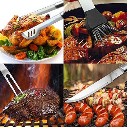 - The Most Complete Kit - This BBQ utensils includes 1 tong, 1 fork, 1 knife, 1 grill brush, 1 basting brush, 4 skewers, 8 corn holders, 1 replaceable head of grill brush, and 1 spatula that has 4 functions(with built-in bottle opener and tenderizer blades). This is a complete and professional grill accessories that contains almost everything you need for grilling;