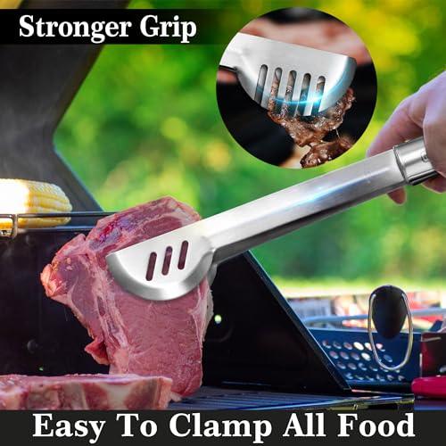 - Special Design - User-friendly is our main design purpose. Reinforced BBQ tongs can easily clip food and is not easy to bend. The spatula is a 4-in-1 multi tool, which includes slotted turner with tenderizer blades and built-in bottle opener. Elongated stainless steel handles keep your hands at a safe distance from the flame while you grill. Hanging rings at the top of each handle enable easy storage during the off-season;