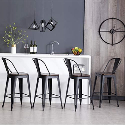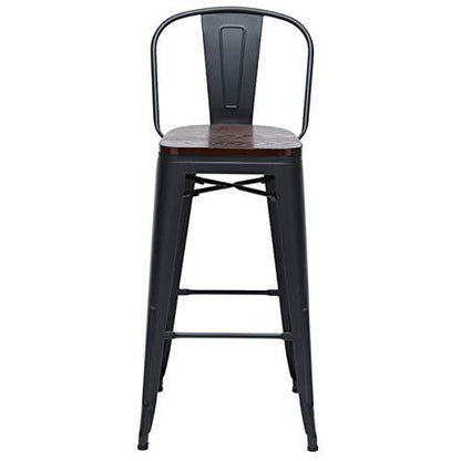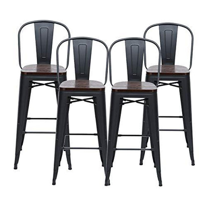 HAOBO Home 30" High Back Barstools Metal Stool with Wooden Seat [Set of 4] Counter Height Bar Stools, Matte Black