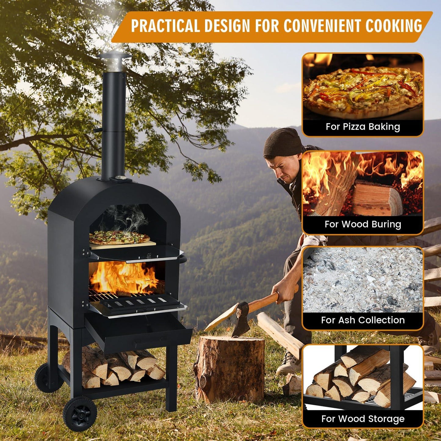 - 【Take Your Need into Consideration】 The complete accessories include a waterproof cover, a pizza peel, a pizza stone, a glove, a brush, a pizza cutter, 5 pizza holders, 2 cooking grids and 2 charcoal meshes. Considering convenient use, the bottom open shelf provides enough space to store wood while pull-out ash collector saves much time in daily cleaning.