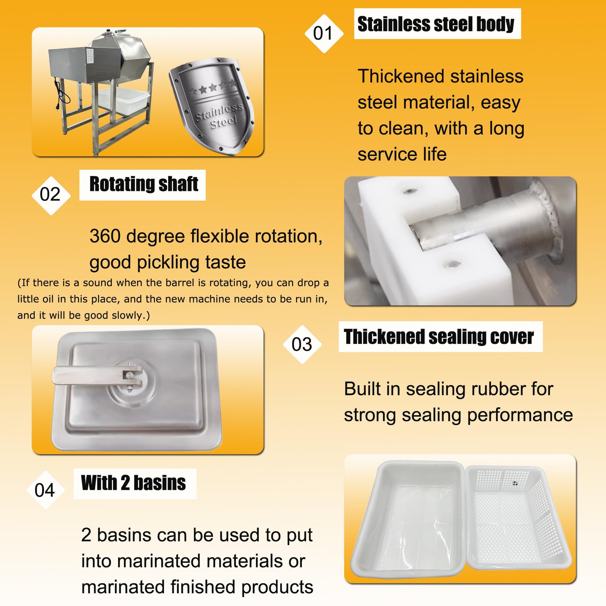 - PREMIUM FOOD GRADE STAINLESS STEEL- The entire vacuum pump meat tumbler marinator is made of food grade thickened stainless steel material. The surface adopts wire drawing technology, which is scratch resistant and wear-resistant. Moreover, the thickened stainless steel lid improves the sealing performance and enhances the pickling effect