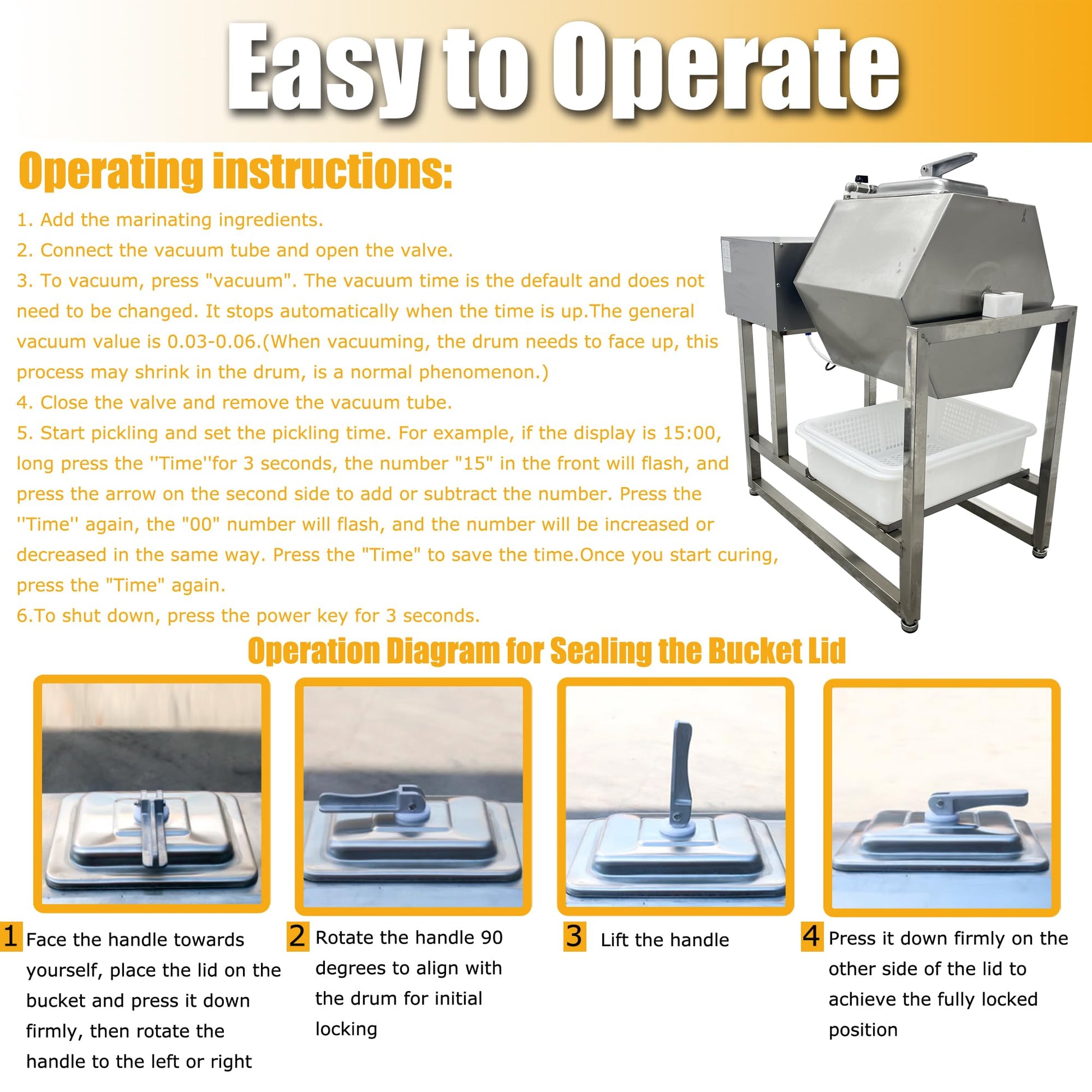 - EASY TO OPERATE- This large capacity meat vegetable tumbler marinator adopts intelligent timing function. You can set the curing time, the machine automatically stops when the time is up, you can set the time range: 0-99 minutes. Equipped with high-definition display screen and gauge. Can control the pickling process at any time. At the same time, the barrel can be taken down for easy cleaning. Simple operation saves time and effort