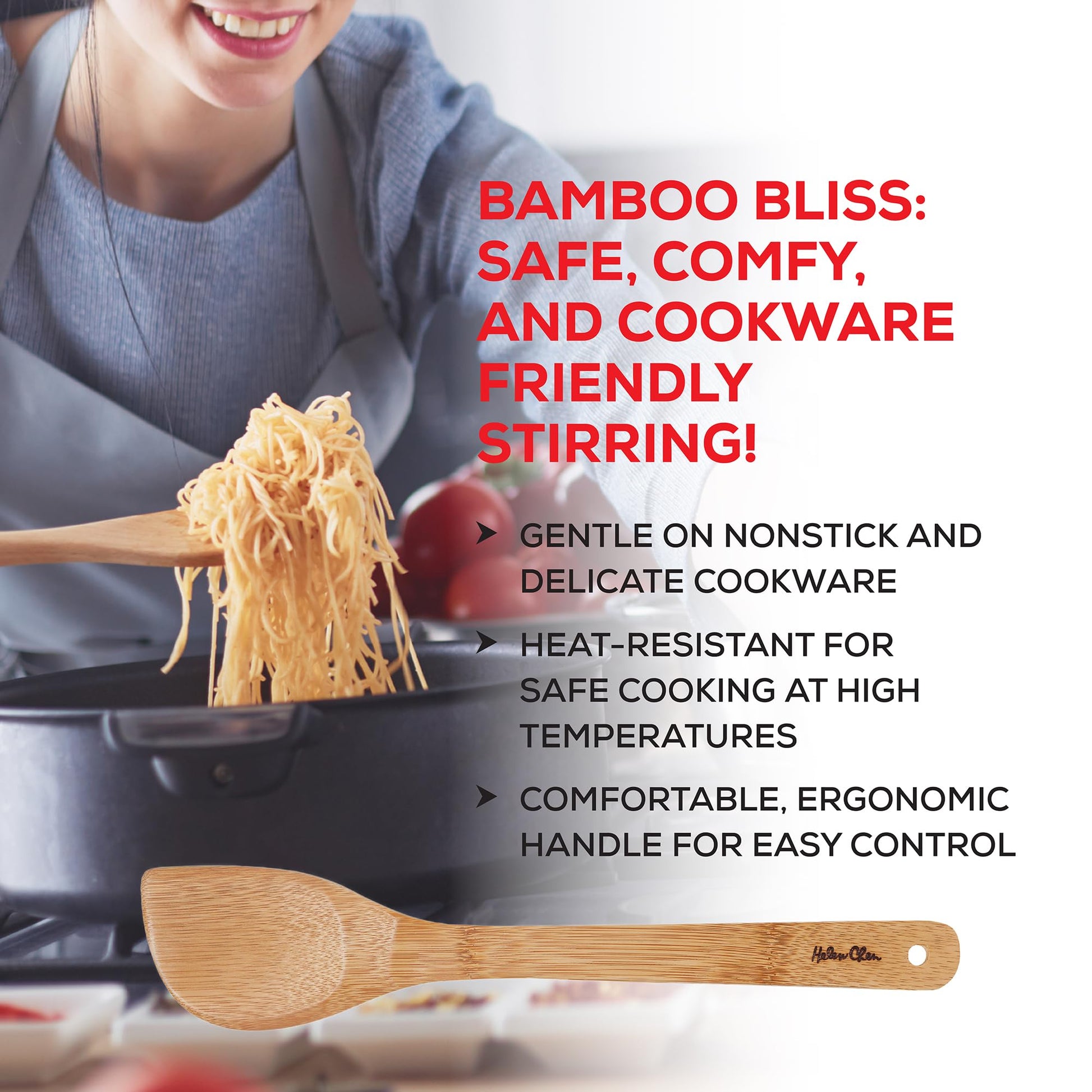 - Helen’s Asian Kitchen Natural Bamboo Stir Fry Spatula for stirring, mixing, dividing, tasting, turning, and serving foods