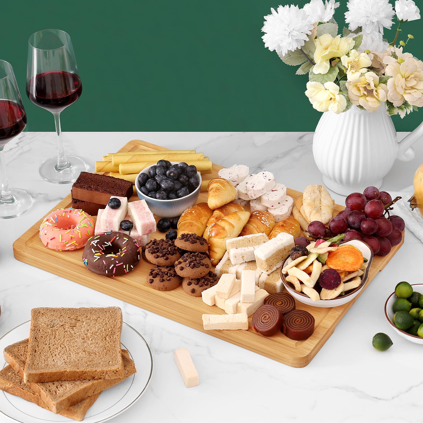- NATURAL ORGANIC BAMBOO: Crafted from natural organic bamboo, our cutting board is not only environmentally friendly but also food safe. It is sturdy and resilient, perfect for slicing bread, fruits, vegetables, meats, steaks, cheeses, or even serving your dishes Unlike plastic boards, which are prone to brittleness and harmful chemicals, our bamboo board is BPA and formaldehyde-free, ensuring a healthier choice for you and the planet