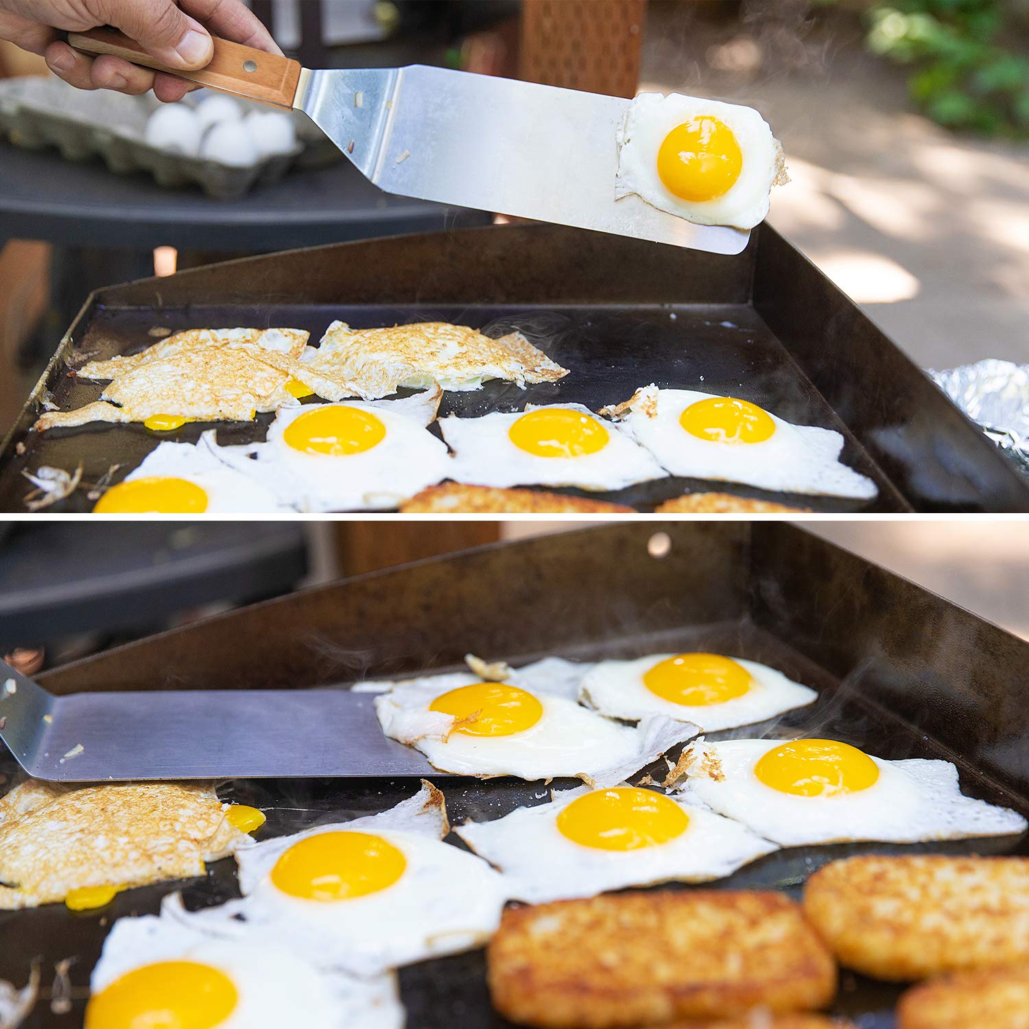 - 🔥【Multipurpose Outdoor or Kitchen Cooking Kit】2 Oversized griddle spatulas, great for flipping beef cubes, fried egg, rice, noodle and vegetables. 2 Regular size grill flippers/turners (can be use as shorter spatulas) with 3-sided bevel cutting edge, great for turning burger,pancake and cutting bread,meat and sausage.