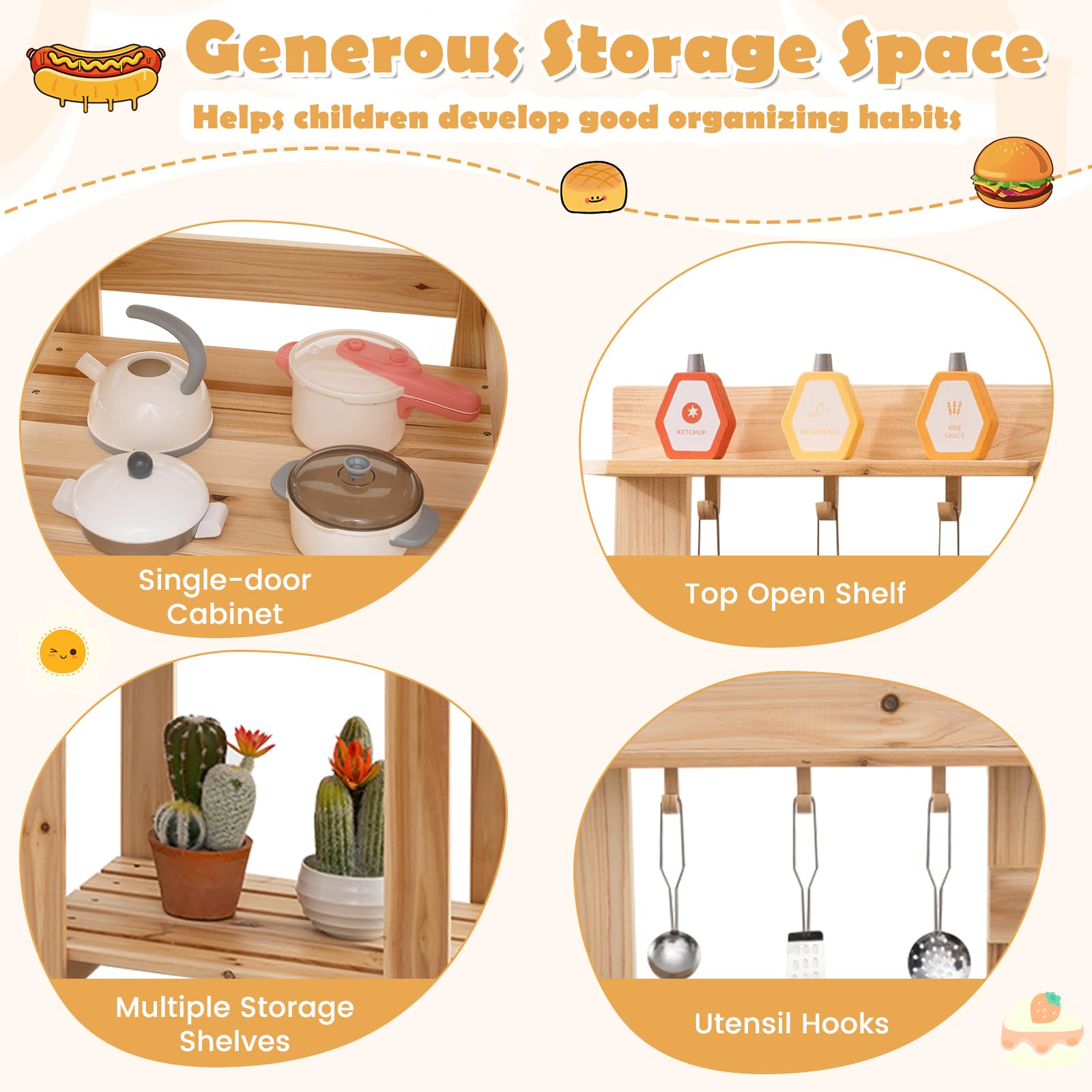 - Built to Last with Fir Wood Structure: This outdoor wooden kitchen set is meticulously crafted from solid fir wood, offering a natural and sturdy play area for children. The crack-resistant fir wood is treated to be splinter-free, ensuring a safe and enduring outdoor setup to stand the test of time and provide endless fun.