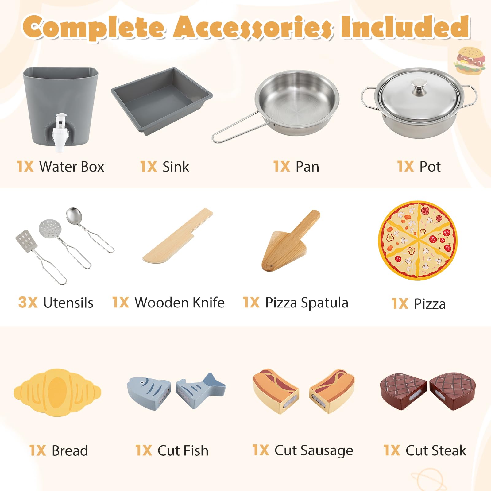 - All-in-One Outdoor Play Kitchen: This 3-piece mud kitchen set includes a mud kitchen, BBQ grill, and pizza oven, equipped with diverse accessories and ample storage space. It serves as a complete play center that can not only stimulate imagination and enhance hands-on skills but also helps kids develop good organizing habits.