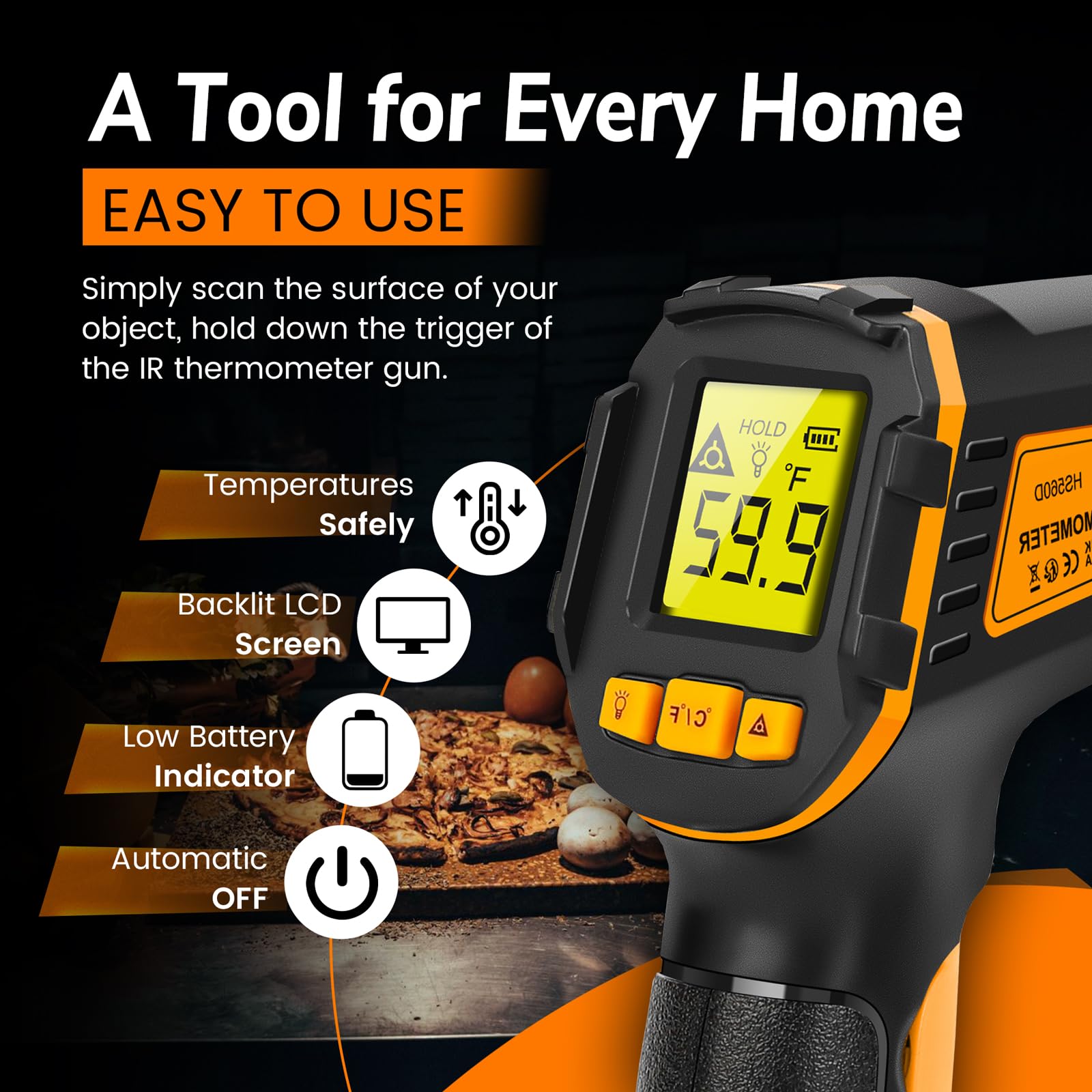 - ►【INSTANT & ACCURATE TEMPERATURE MEASUREMENT】Infrared thermometer gun offers precise, contactless readings from -58°F to 1112°F (-50℃~600℃), ensuring within 0.5 seconds. Release the trigger to lock in readings, guaranteeing measurement precision.