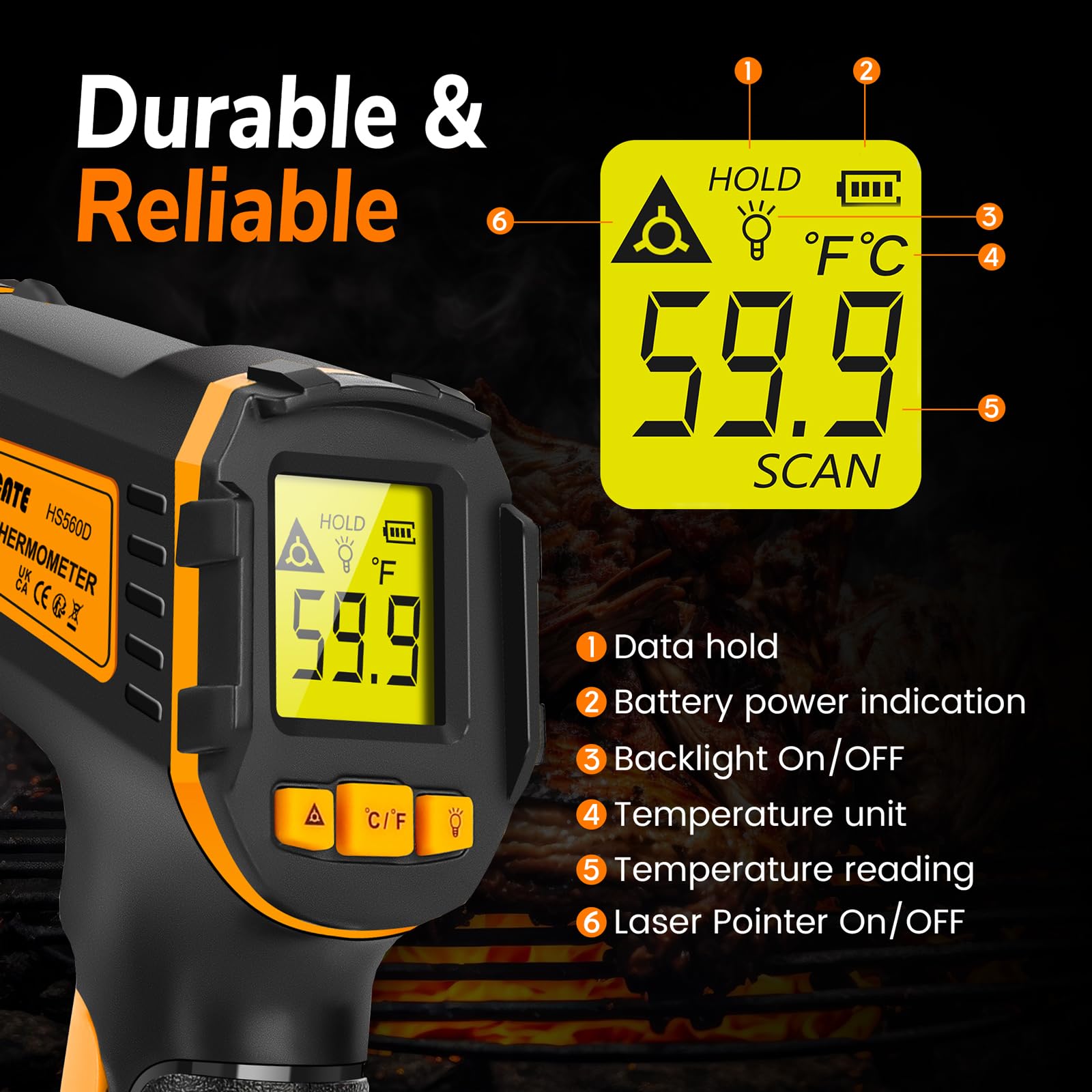 - ►【DURABLE AND RELIABLE】Infrared food thermometer gun constructed with top-quality materials, this thermometer is built to endure diverse environments, ensuring long-term accuracy and reliability for consistent temperature measurements. It is an essential tool for various applications including cooking, BBQ, vehicle repair, and more, best gift for you family.