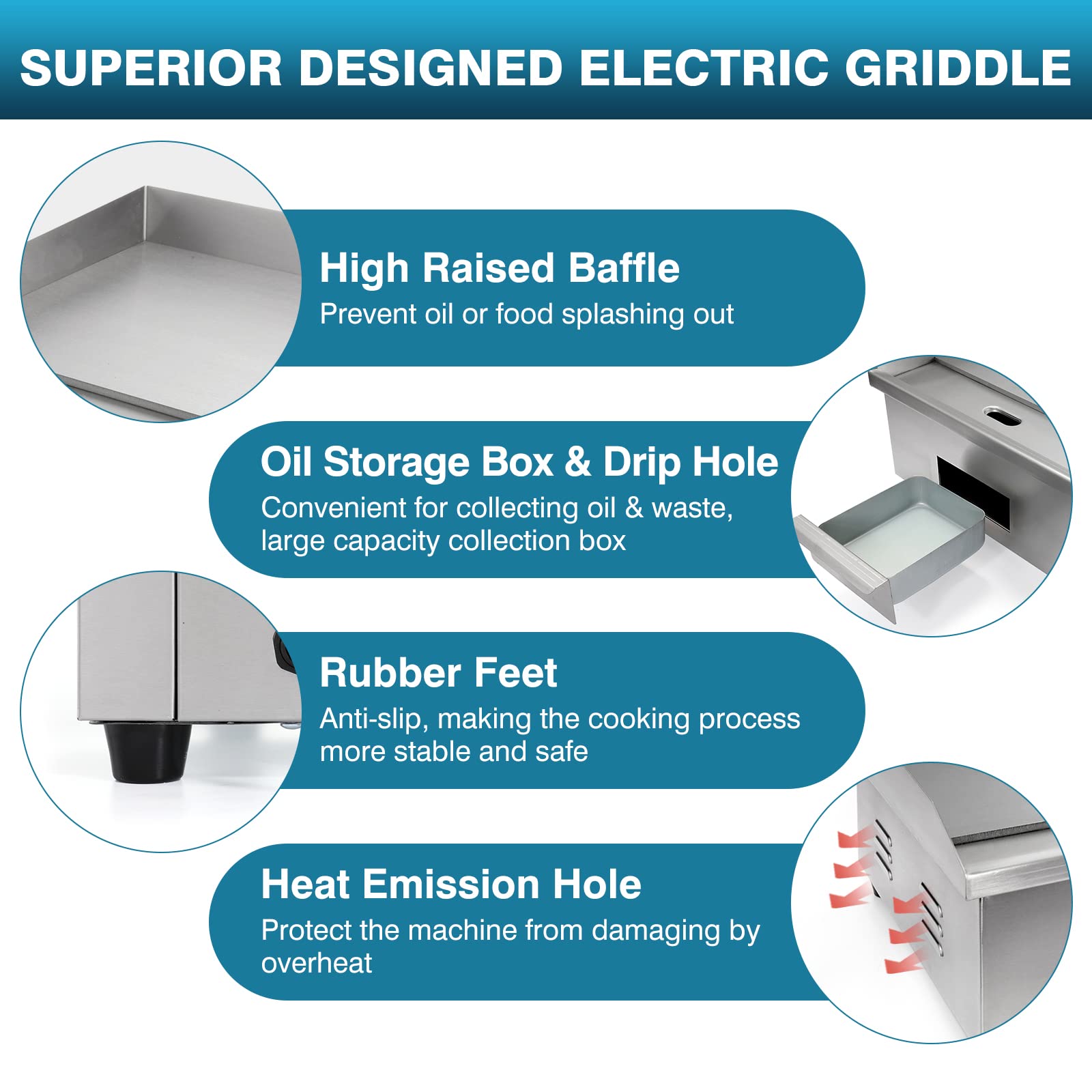 - 【3000W Fast Heating Commercial Griddle】This electric flat top grill boasts 3000 watts of high working power and dense heating coils, offering fast heating and good heat distribution. Functional electric griddle for home, restaurant, hotel, party, snack bars, food store, supermarket and great for making pancakes, bacon, grilled cheese, fried dishes, omelet, pizza, steak, burger.