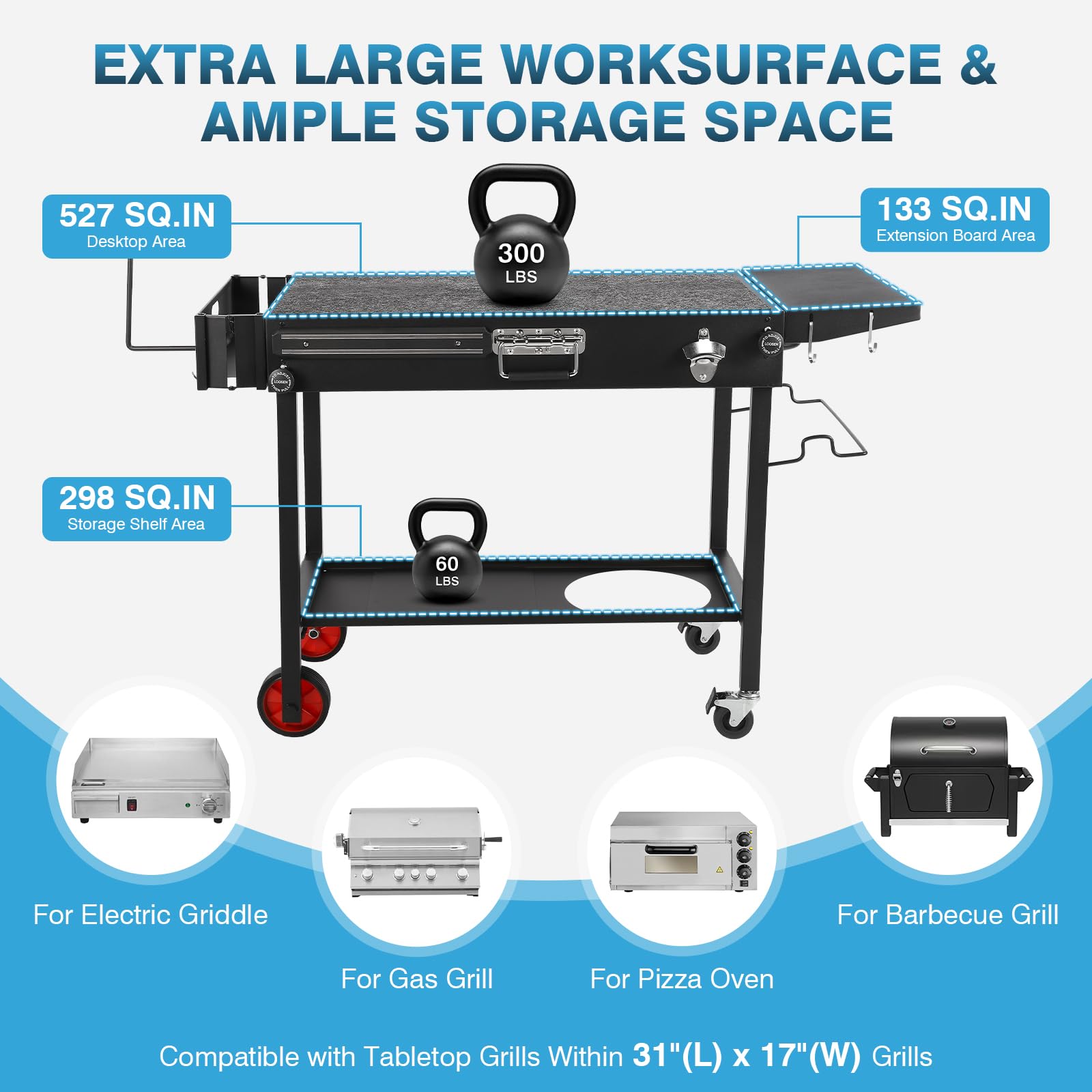 - 【Ample Work Space & Storage Area】With a main tabletop area of 527 sq. in., an extension panel of 133 sq. in., and a storage shelf of 298 sq. in., our folding grill table for outside provides plenty of space for your grilling needs. This barbecue cart accommodates grills or griddles up to 31"L x 17"W, making it ideal for countertop electric griddles, pizza ovens, wood-fired grills, and camping stoves.