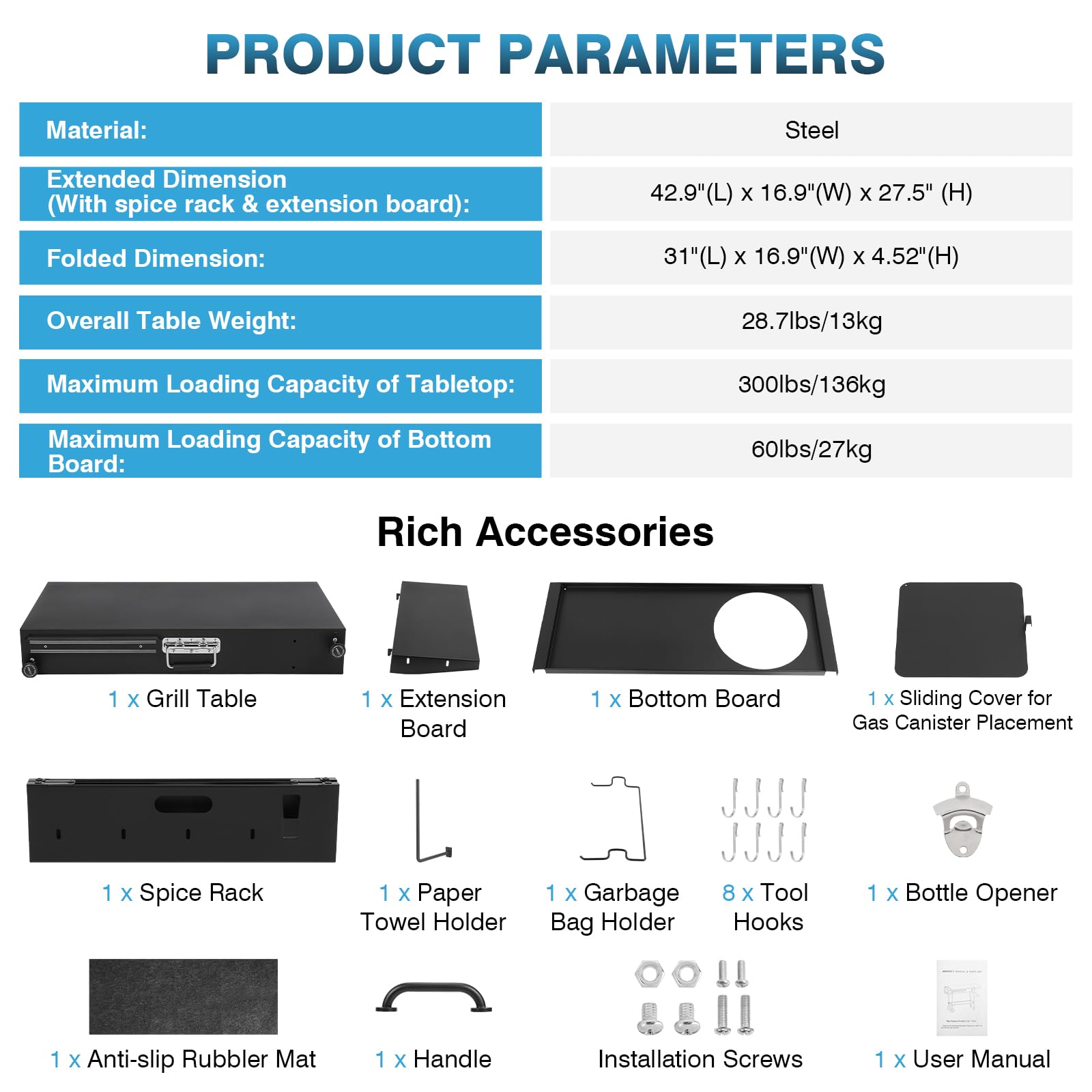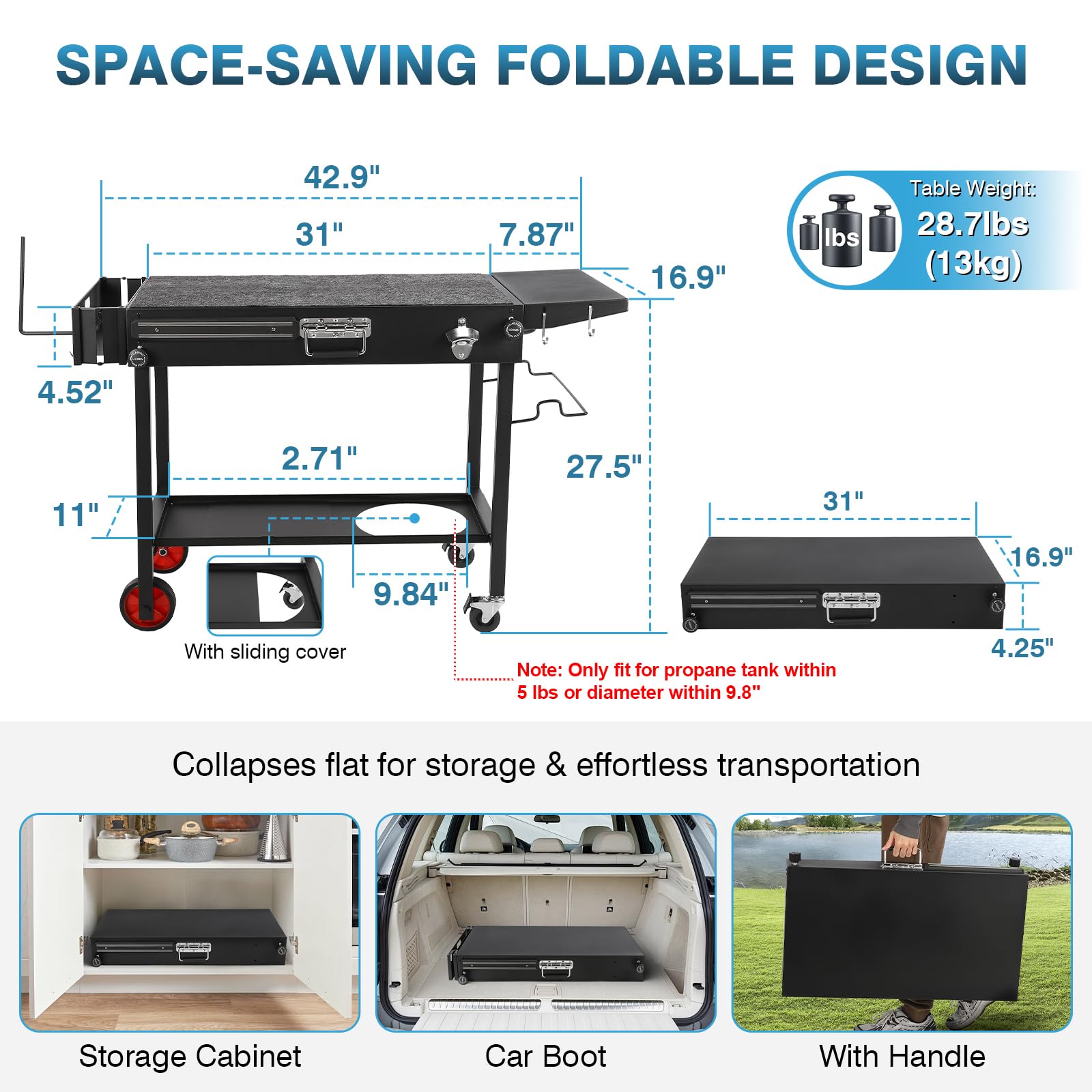 - 【Compact & Portable Grill Table】The IRONWALLS folding grill carts table measures 42.9"L x 16.9"W x 27.5"H when fully set up (including the spice rack and extension panel) and folds down to a compact 31"L x 16.9"W x 4.52"H. Weighing in at 28.7 lbs (13 kg), it's designed for easy storage in your car trunk or RV. The convenient lifting handle makes it a breeze to carry outdoors.