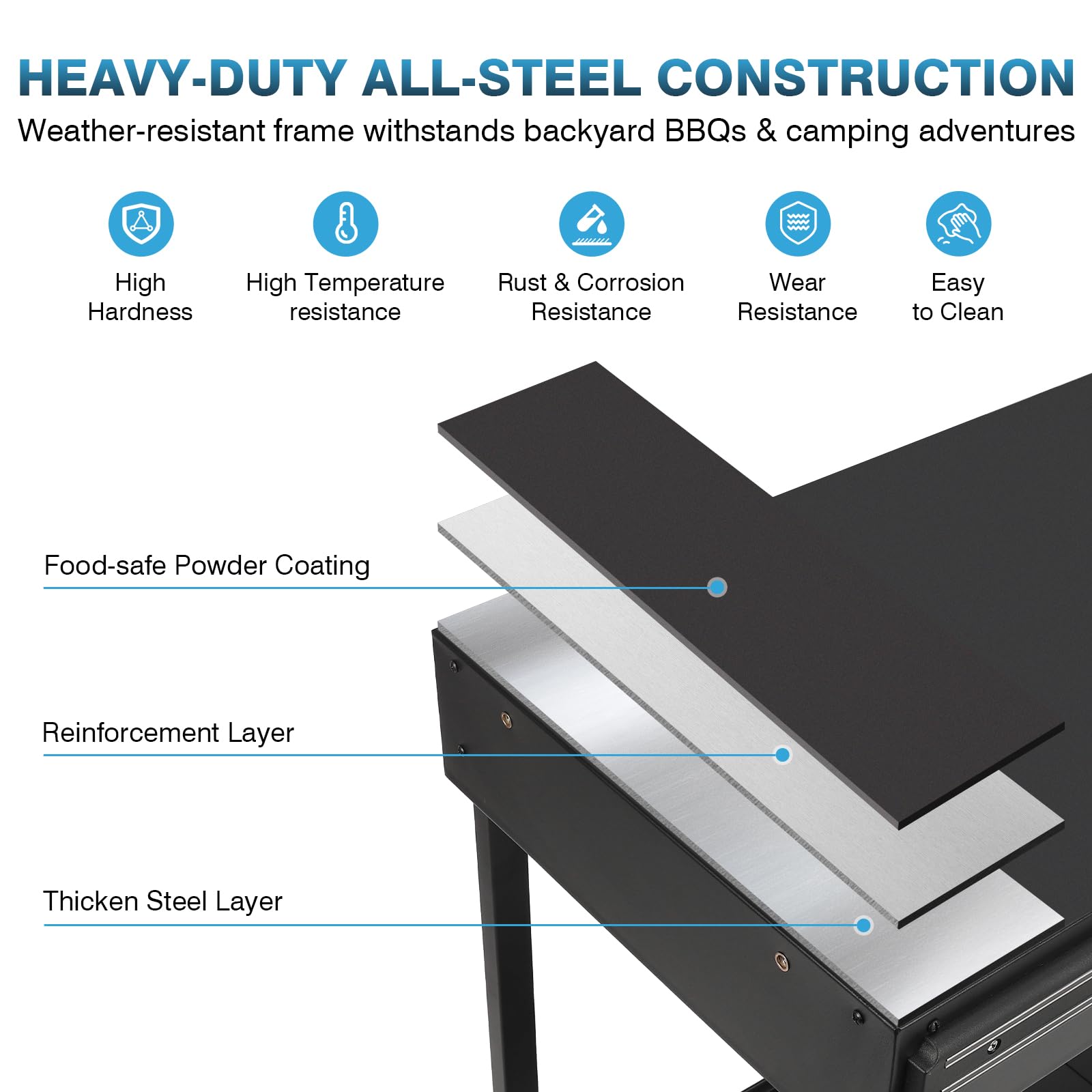 - 【Heavy-Duty Steel Grill Cart】Crafted from thickened steel, this portable grill carts can support up to 300 lbs on the tabletop and 60 lbs on the storage shelf. Its anti-corrosion and heat-resistant powder-coated finish ensures the grill stand can handle tough outdoor conditions, while the rust-proof frame guarantees long-lasting durability, even in humid or rainy weather.