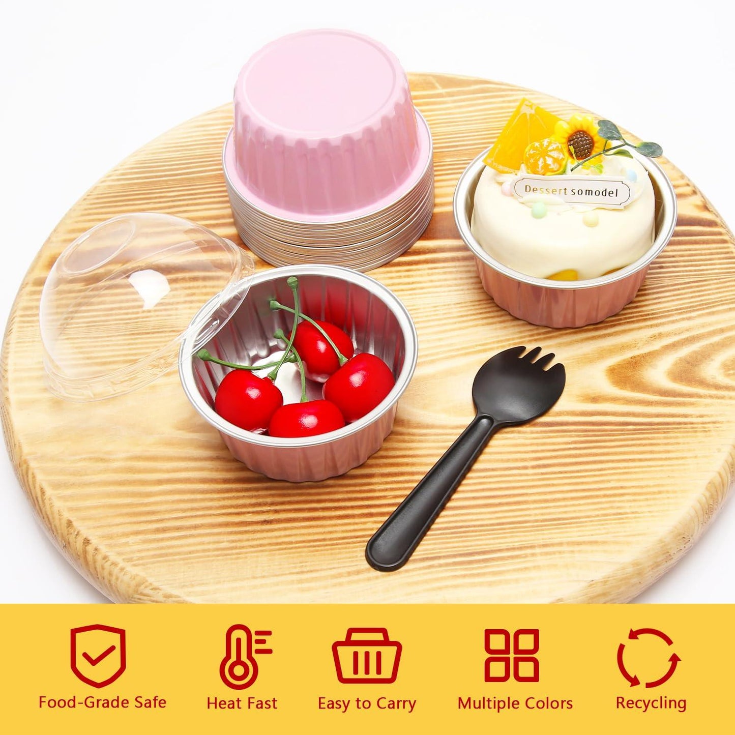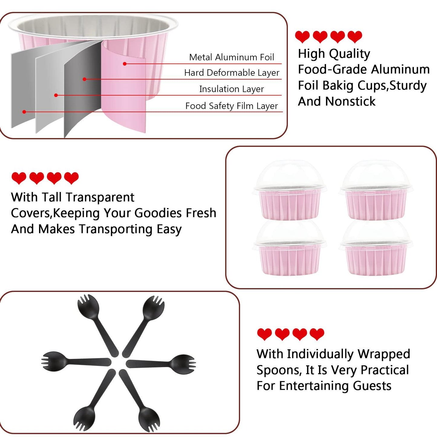Details: Specifications:The Package Includes:50 x Cupcake Cups + 50 x Clear Dome Lids + 50 x Black SpoonsMaterial:Solid Food-grade Aluminum FoilVolume:About 5 ounceDimensions: Cups: Top Circle: 3.35" , Bottom: 2.56 " , Height: 1.5"Dome Lids: Circle: 3.35" , Height: 1.5"Spoons:Length: 4.5" , Width: 1.3"Feature:NO BAKING TRAY NEEDED:The aluminum foil cupcake liners are sturdy and thick enough,which enable the cups stand well.WITH TALL DOME LIDS:The matching clear dome lid height 1.5", is more suitable for adding frosting to the baked cupcake.IDEAL DESSERT RAMEKINS:This muffin tins are great for cupcake,muffin,mini pie, small cake,souffle, pudding, cheesecake, jello,creme Brulee,snack and much more.WIDE APPLICATION:Our muffin liners with lids and spoons are suitable for family individual use, bakery and restaurants, alsosuitable for various occasions, such as weddings, baby showers,thanksgiving,Christmas,etc.Tips:1.Lids come with a combination of two. Separate them when using please.2.The clear lids are not heat resistant and cannot be put in the oven!Please allow cups to cool prior to applying lids.3.Please use anti-scald gloves to avoid burns when taking them out of the oven.