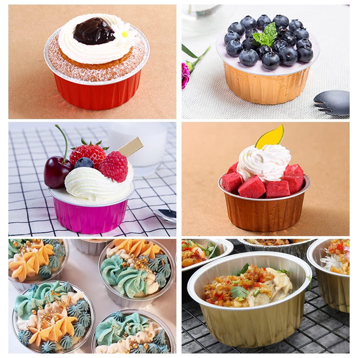 - 【Proper Size 】 - These muffin cups size: 3.35"D x 1.5"H;The matching clear dome lid height 1.5".The metallic muffin tins hold about 5 oz food capacity. The tall dome cover is more suitable for adding frosting to the baked cupcake.Ideal foil ramekins for cupcake,muffin,mini pie, small cake,souffle, pudding, mini cheesecake,custard,creme Brulee and much more.