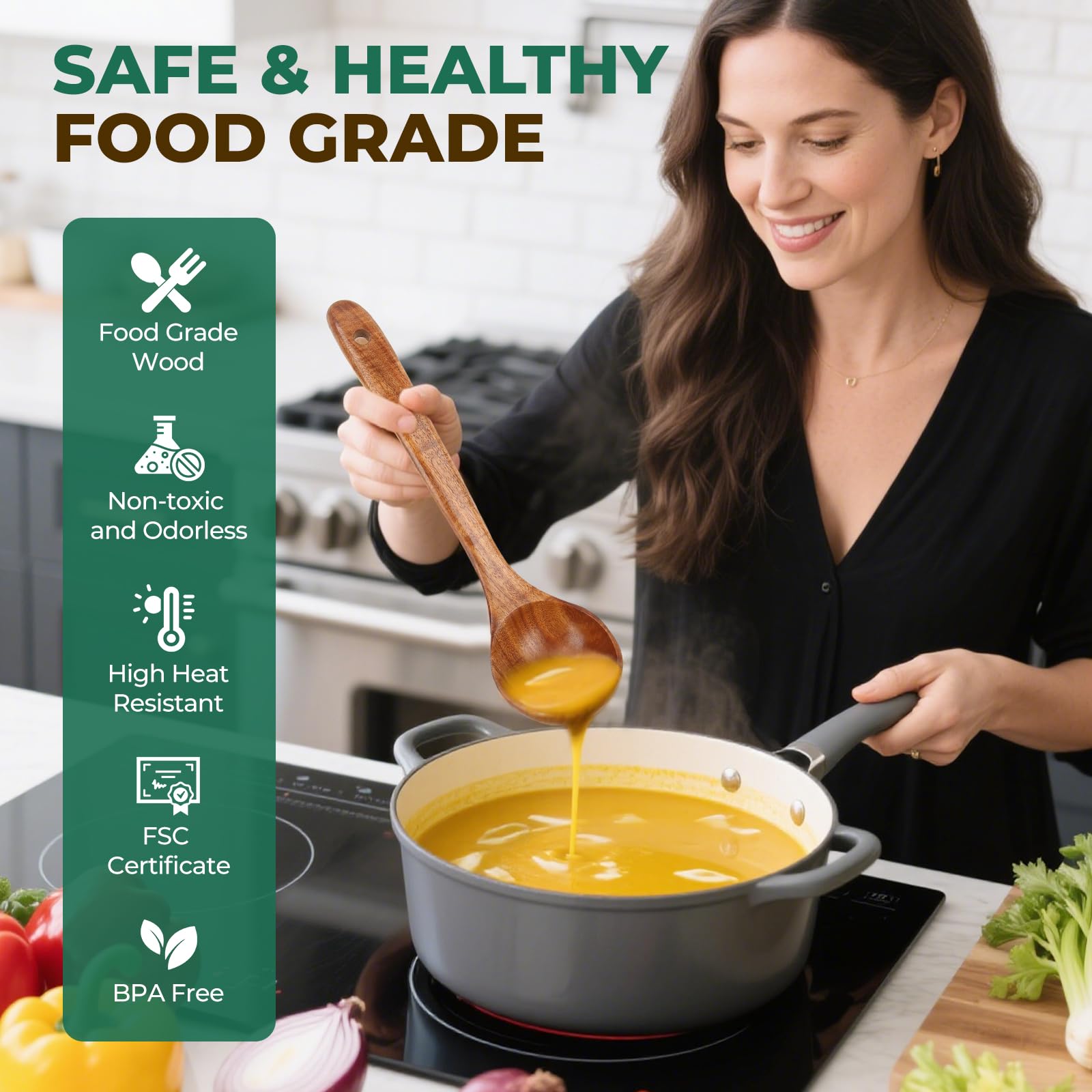 - 【Non-Reactive & Durable to Use】Unlike metal or plastic, wood utensils set for cooking are non-reactive and heat-resistant, will not melt and smell, also not transfer taste to your food. Designed with a long handle, wooden spoons for cooking are comfortable to hold and stir. Definitely a great wooden kitchen utensils gift.
