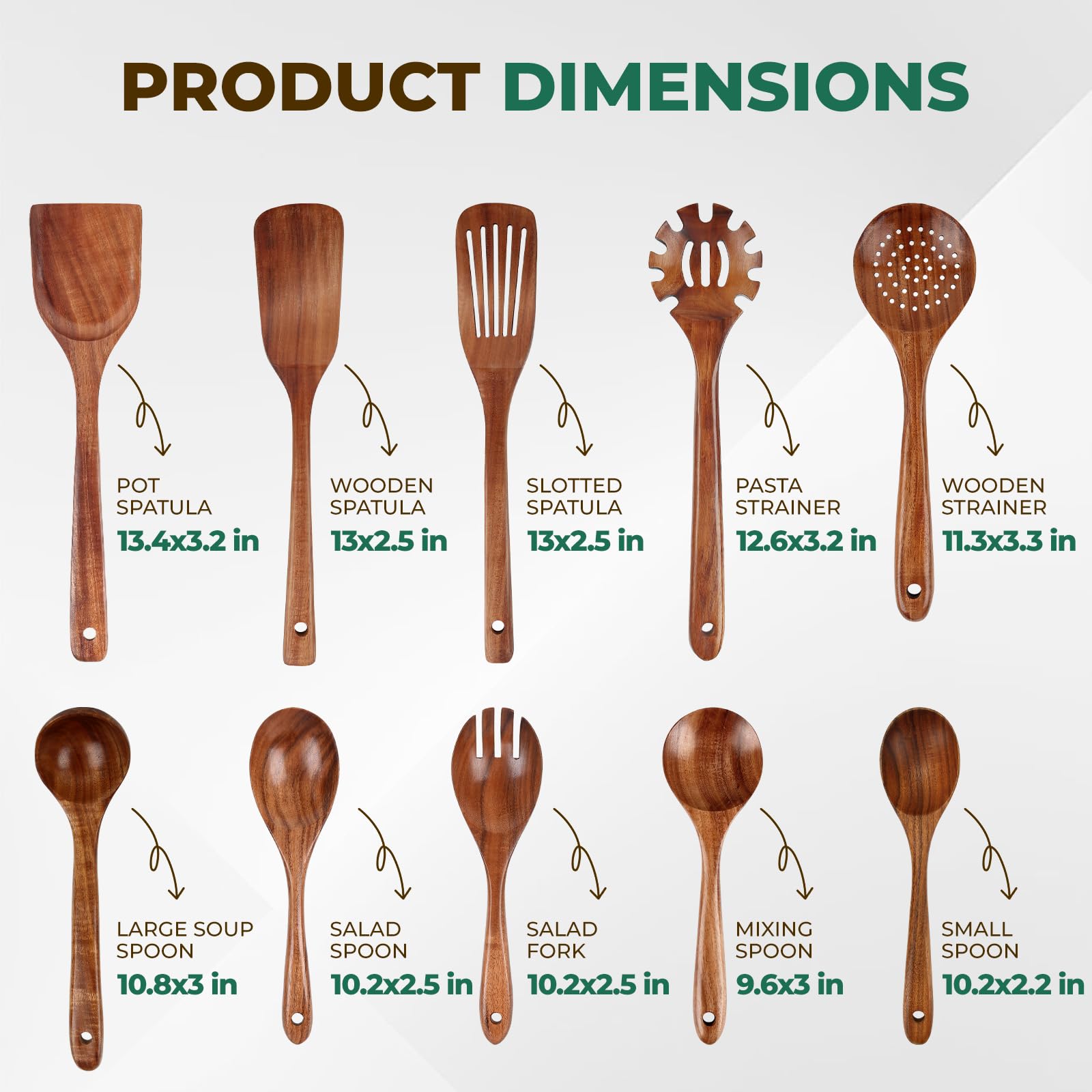 KAQISE 10PCS Wooden Utensils Set, Teak Wood Spoons&Spatulas,Kitchen Utensils for Nonstick Cookware-Spatula|Soup Ladle|Strainer Spoon|Pasta Fork,Heat Resistant Wooden Cooking Tools