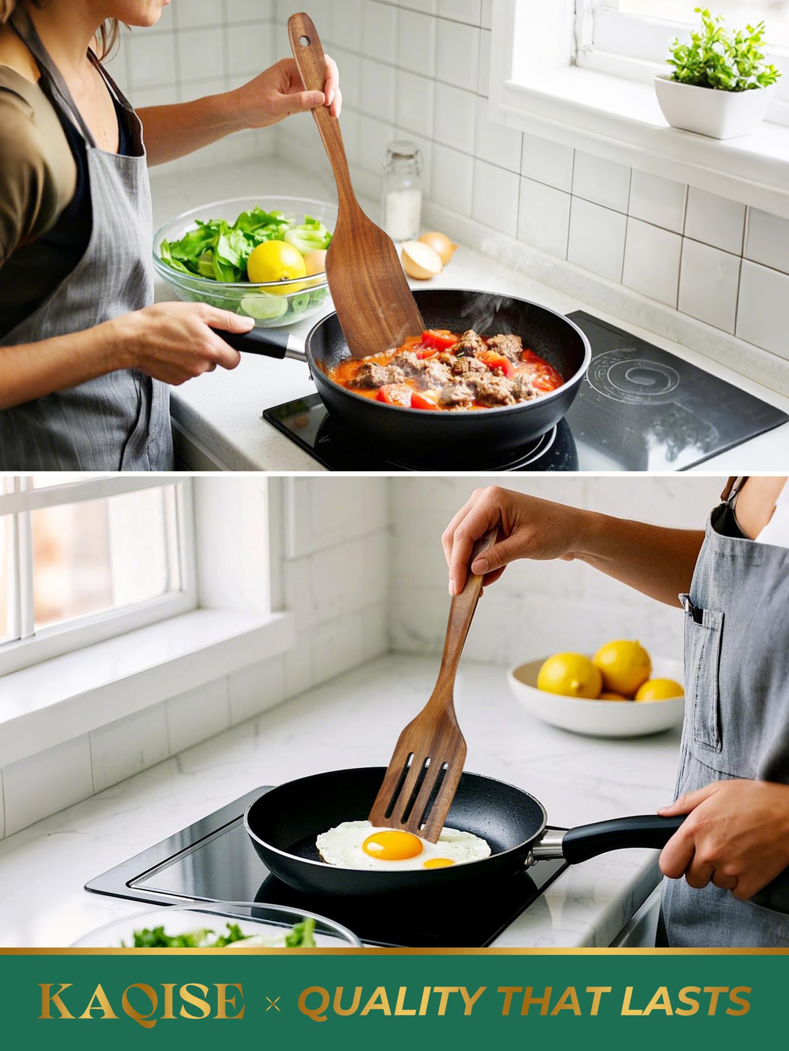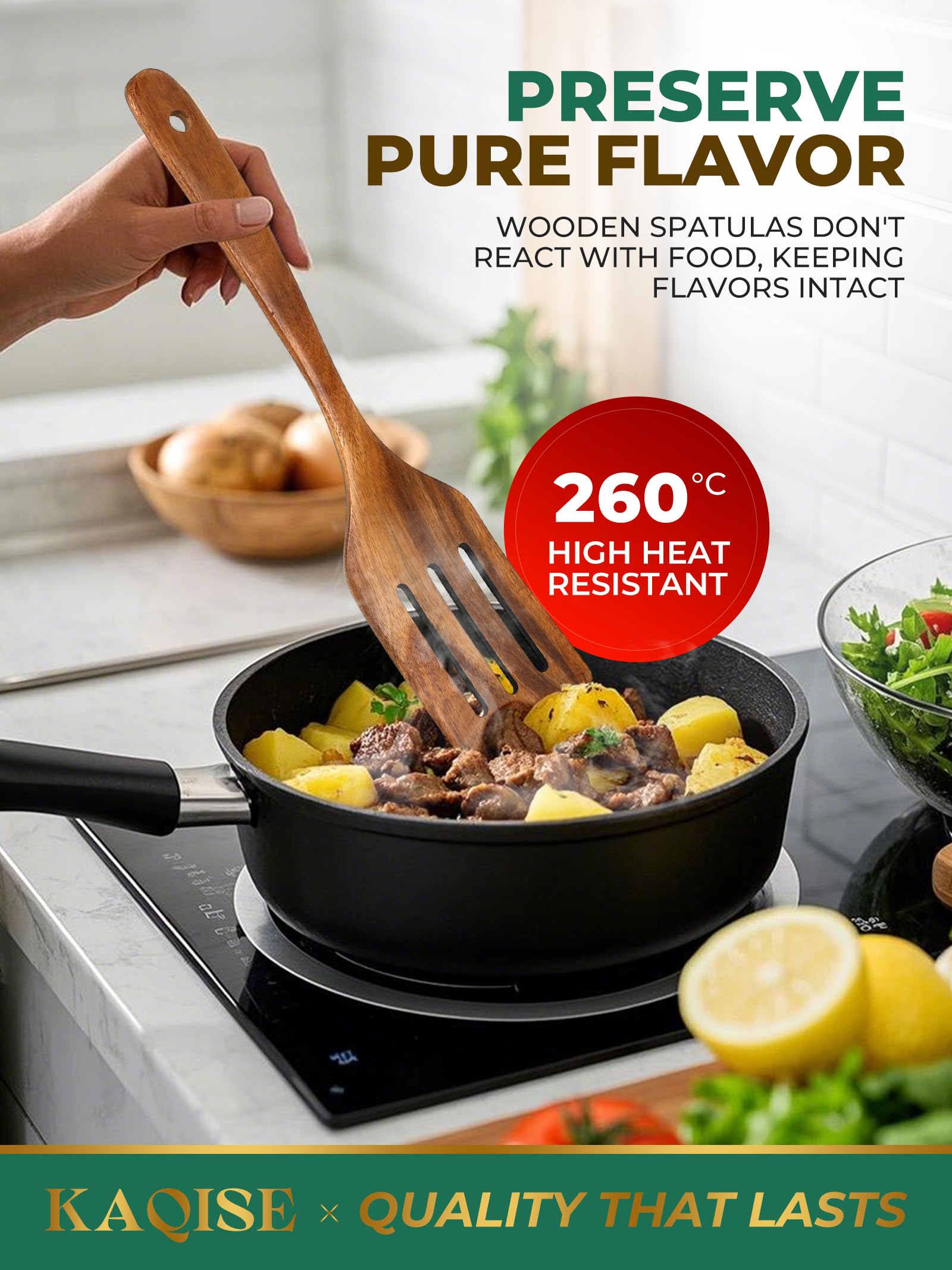 - 【High-Temperature Resistant】: Crafted from Teak Wood, this Wooden Spatula and Slotted Spatula Set is designed to withstand high heat without warping, cracking, or melting. Whether you're cooking over a hot pan or stirring in boiling liquids, these spatulas maintain their strength and integrity, making them an essential part of any Cooking Utensils Set.