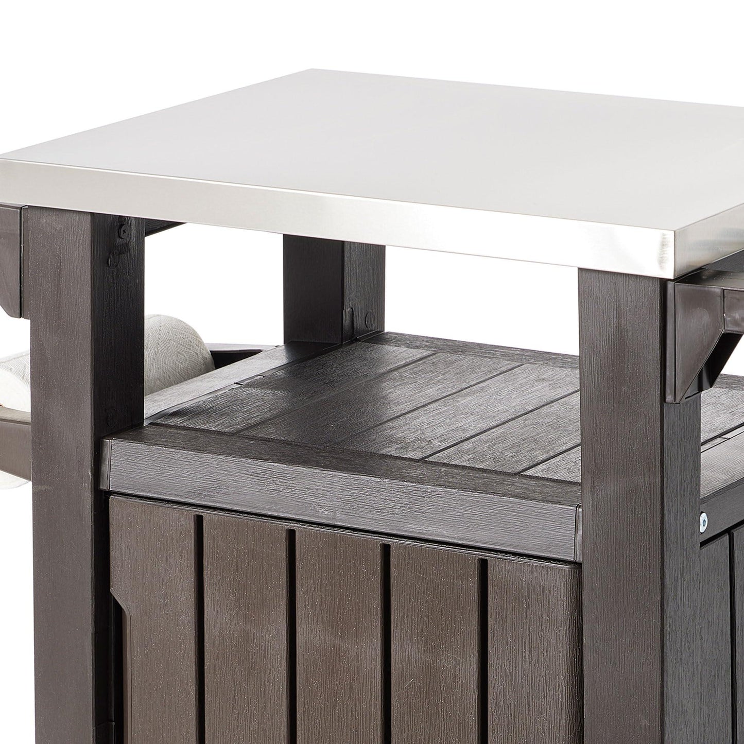 Keter Unity 35.4 Inches x 29.6 Inches x 22.7 Inches Stainless Steel and Resin Outdoor Kitchen Cart with Storage Cabinet and Hooks, Espresso Brown