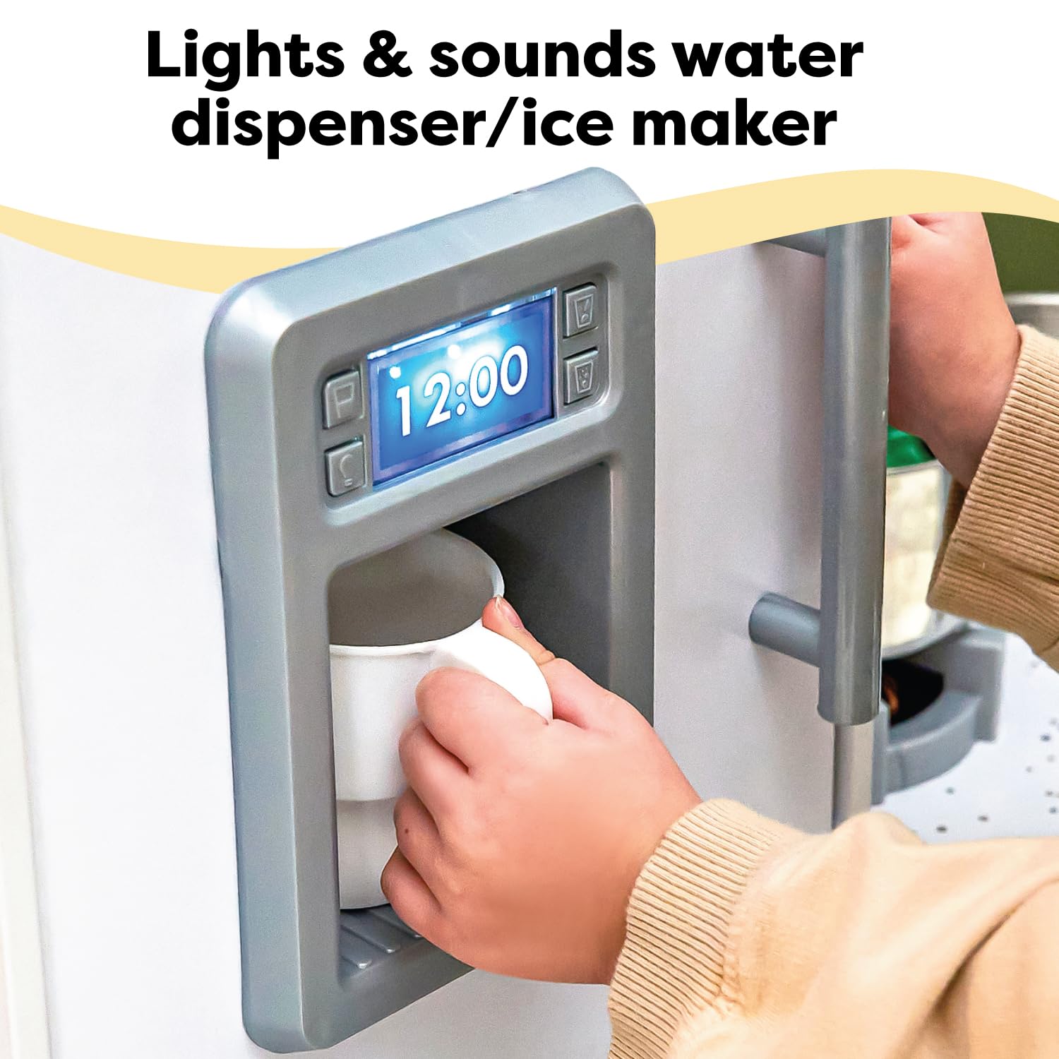 - LIGHTS and SOUNDS: The burners light up and make cooking sounds; water dispenser also lights up and makes realistic sounds when pressed.
