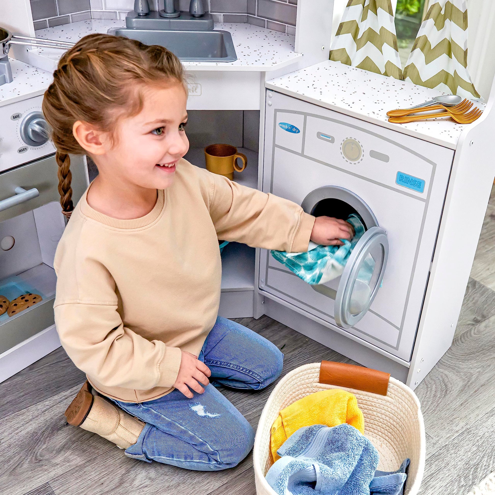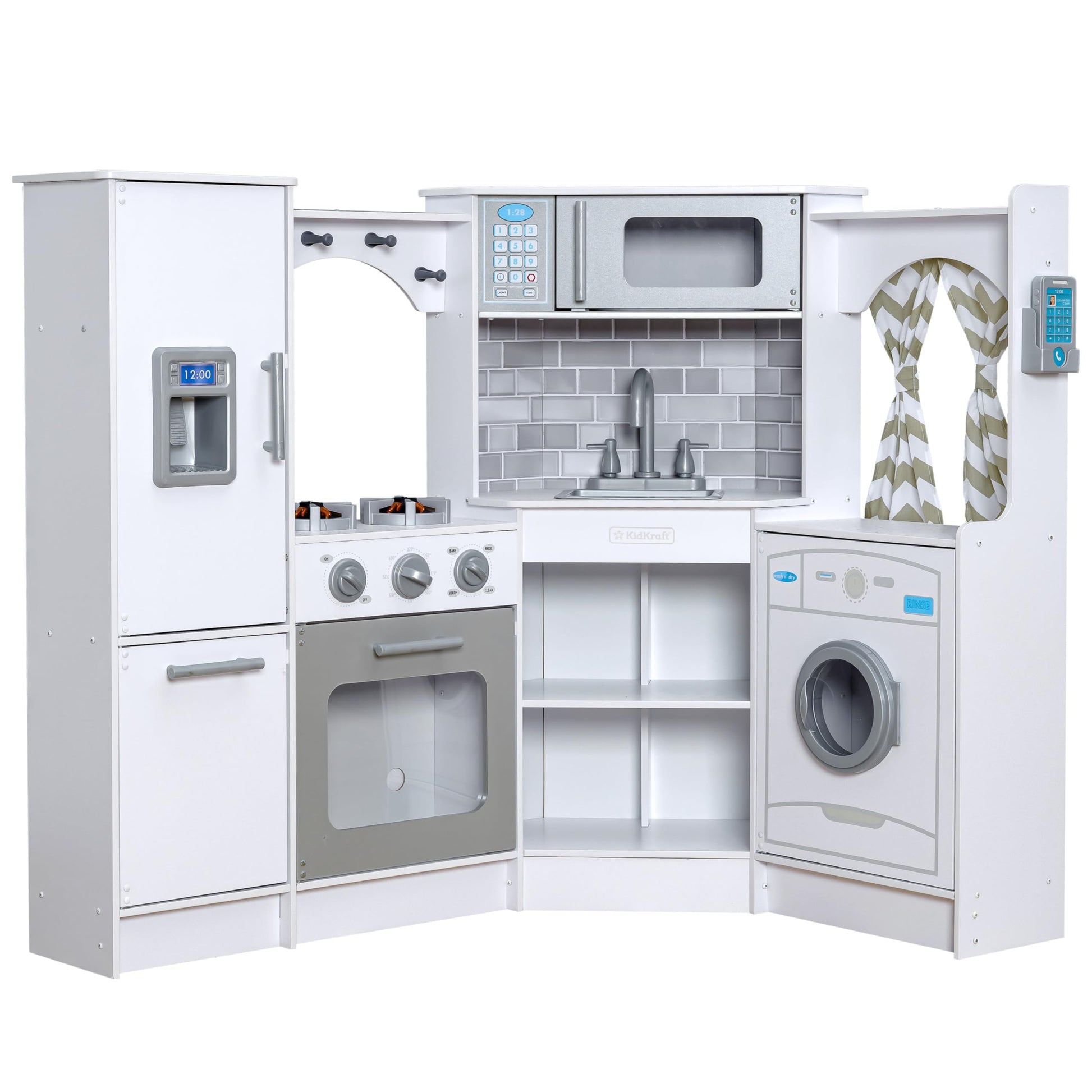 Details: Our KidKraft Ultimate Corner Play Kitchen Set with Lights and Sounds is loaded with fun interactive features to engage your little chefs and keep them cooking. The stovetop burners and ice maker both feature lights and sounds, oven knobs turn and click and appliance doors really open and close. Functional shelving and cabinets with doors that open and close provide plenty of convenient storage for any KidKraft kitchen accessories. The L-shaped design is perfect for placing in a corner of the room to not take up as much wall space. Adorable fabric curtains give that realistic homey touch. Made of wood for long-lasting play, this toy kitchen is styled with on-trend colors and countertop and backsplash designs. With so much to explore, kids will feel like they're cooking just like Mom and Dad!