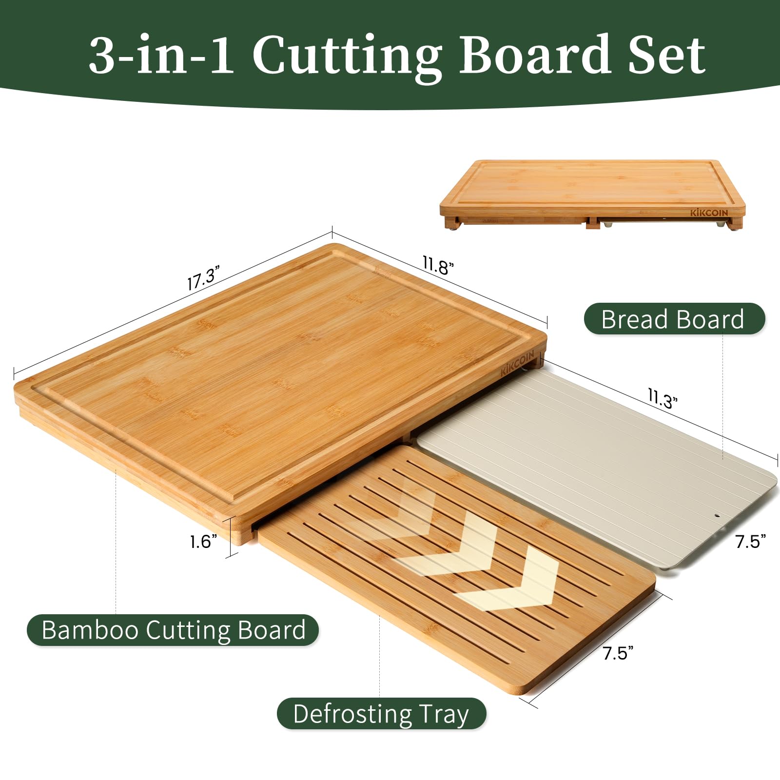 Kikcoin Bamboo Cutting Board Set with Defrosting Tray, Wood Cutting Boards for Kitchen with Deep Juice Grooves & Built-in Organizer Meal Prep Charcuterie& Chopping Board for Meat, Vegetables and Bread