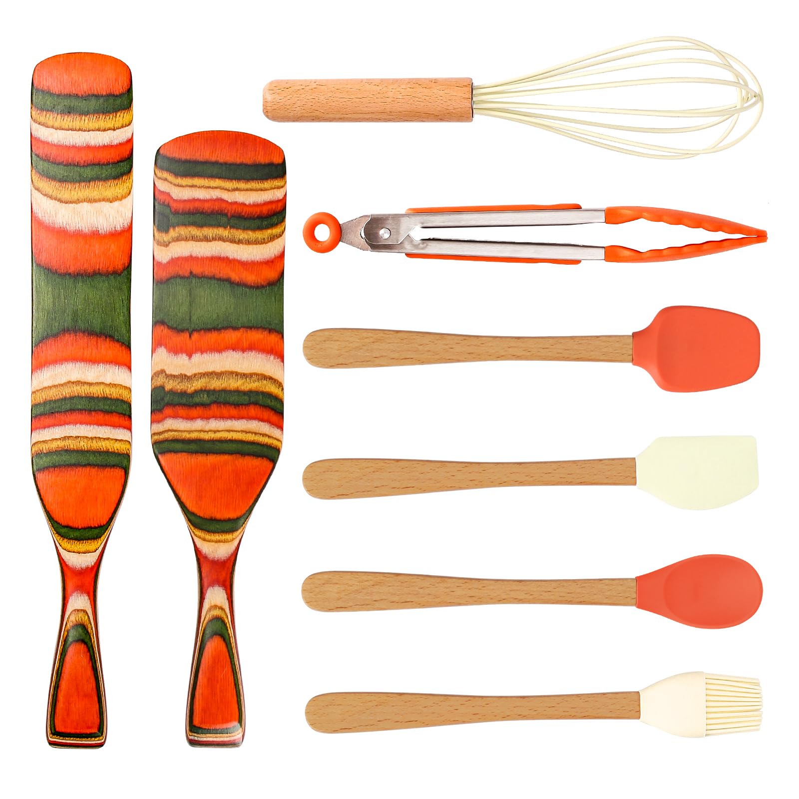 Kitchen Utensils Set,8PCS Spurtles Kitchen Tools,Pakkawood Spurtle Set,wooden Handle silicone Cooking Utensils Set,with Whisk,Brush,Tongs, Spoon Spatula,Silicone spoon