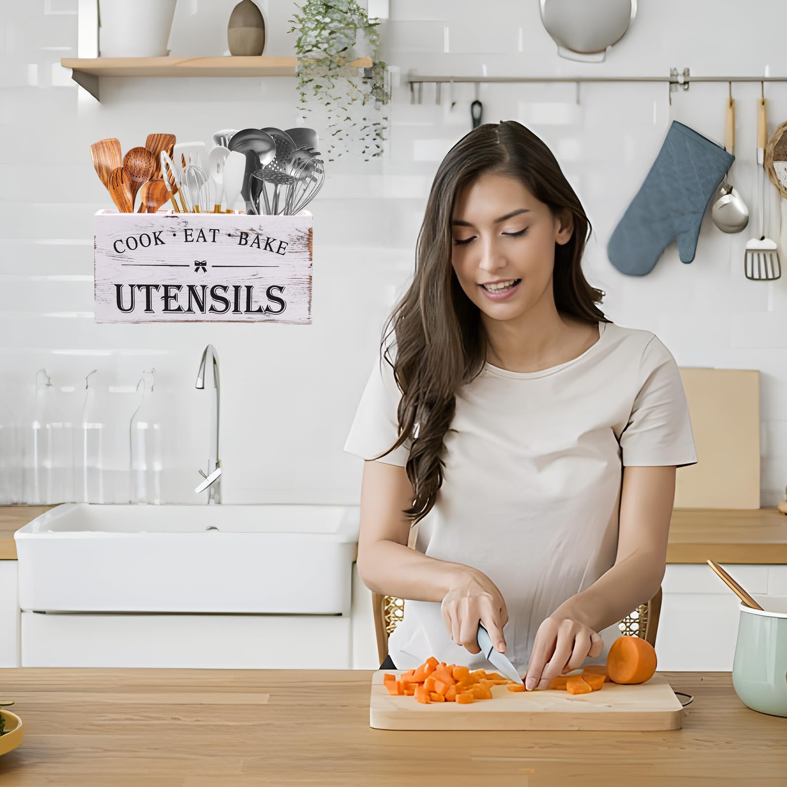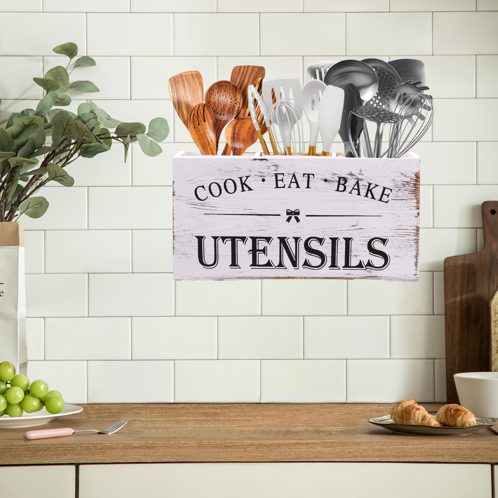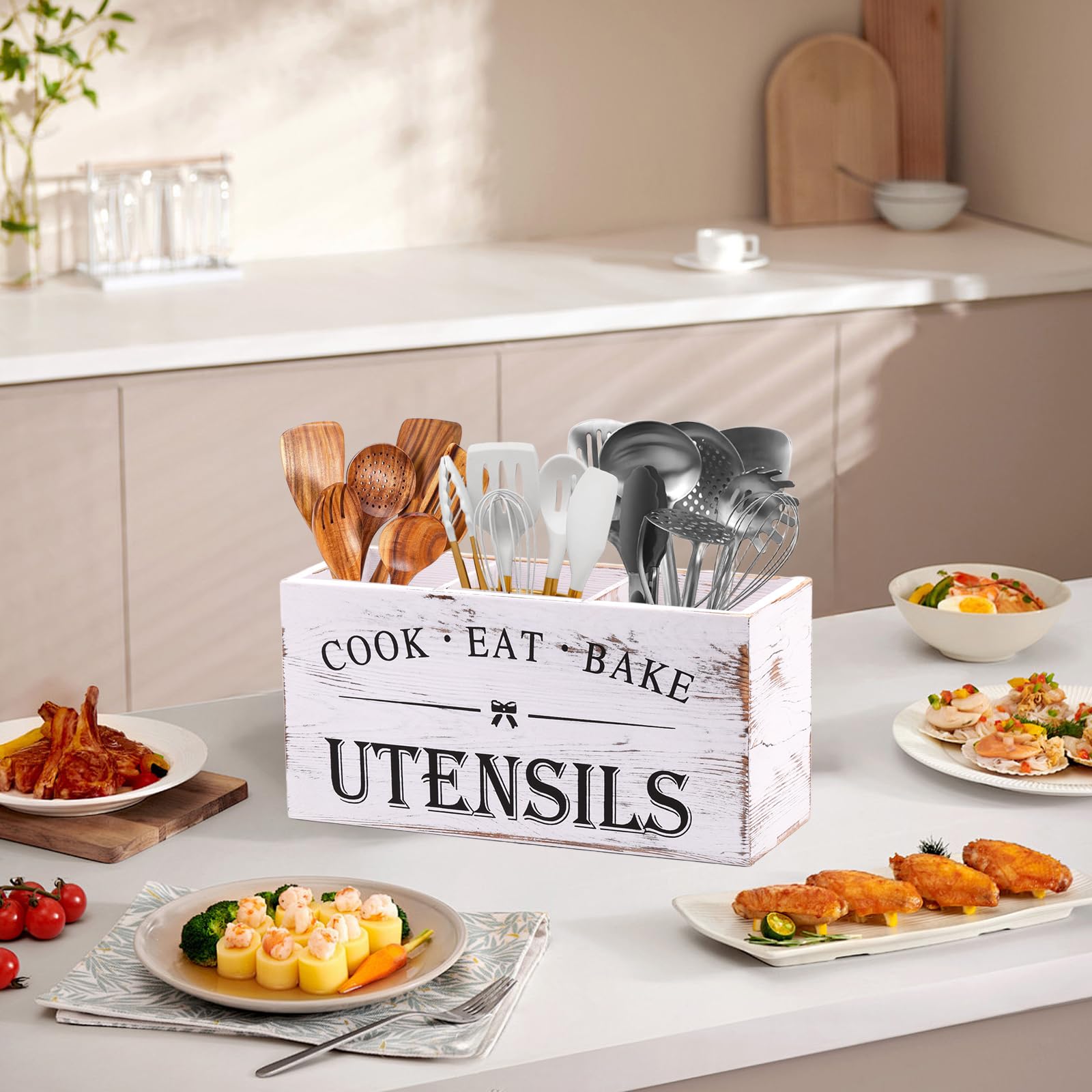 - Farmhouse Wooden Utensil Holder: Our kitchen utensil holder with 3 compartments to neatly separate spatulas, spoons, whisks, and other cooking tools—so everything stays organized and ready to use. No more digging through cluttered drawers!