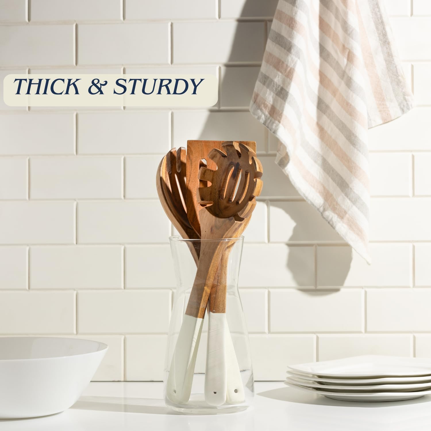 Lavaux Designs Wooden utensils for cooking set of 8, Natural Acacia Wood spoons and spatula set, Non-stick, Durable, Eco- friendly and safe kitchen cooking spoon | white handles | 12 inch each
