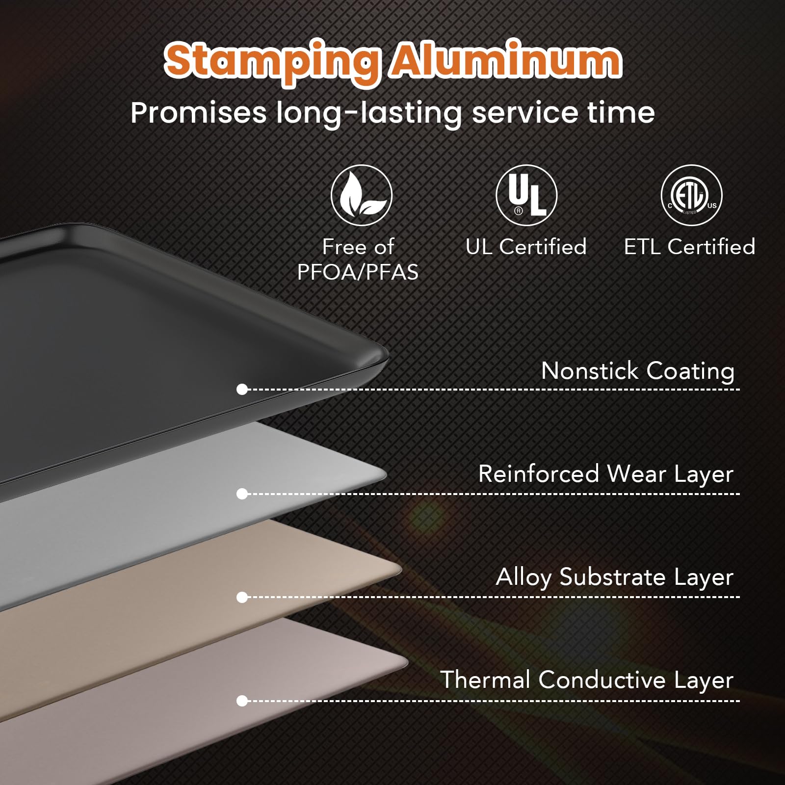 - Large Cooking Surface & Even Heating:This electric griddle features a 27” x 9” nonstick surface, large enough to cook meals for 6-8 people simultaneously. Engineered with die-cast aluminum construction (thermal conductive layer + alloy substrate), it ensures even heat distribution across the entire surface for seared steaks, crispy bacon, or golden pancakes.