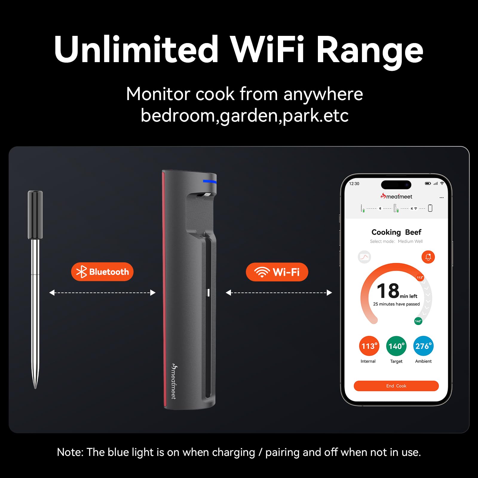 - Wireless and Unlimited: Whether you are grilling outdoors or cooking indoors, with mature WIFI technology, you can remotely monitor from anywhere. No need to stay by the grill, you can enjoy the party while ensuring that the food is cooked to perfection