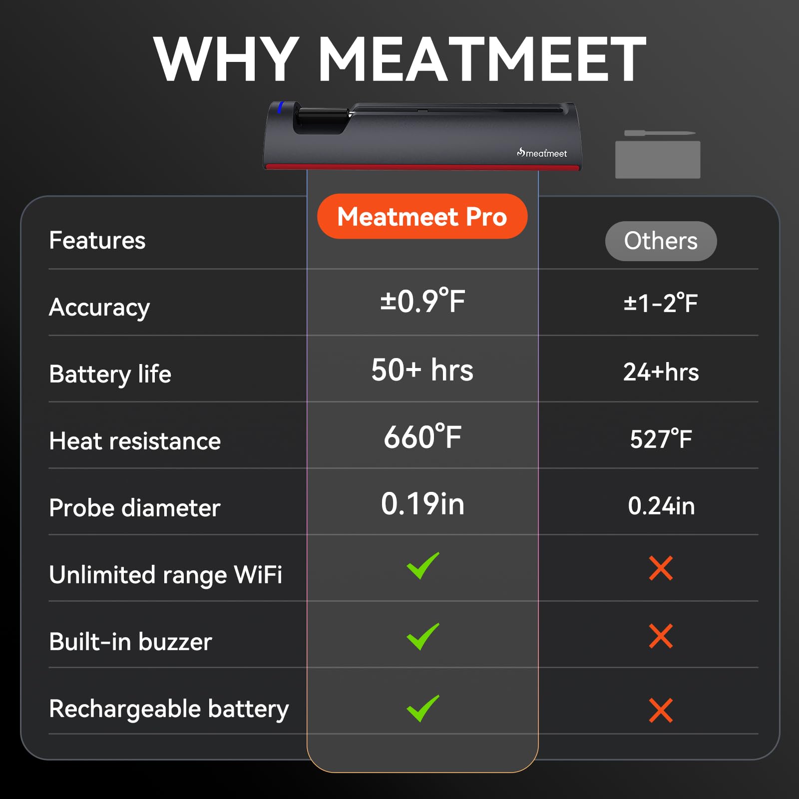 Meatmeet Pro Smart WiFi Wireless Meat Thermometer, Unlimited Range, Improved Stability, Ultra-Thin Probe, Bluetooth Digital Food Thermometer for Remote Monitoring of Oven/Kitchen/BBQ/Grill/Rotisserie